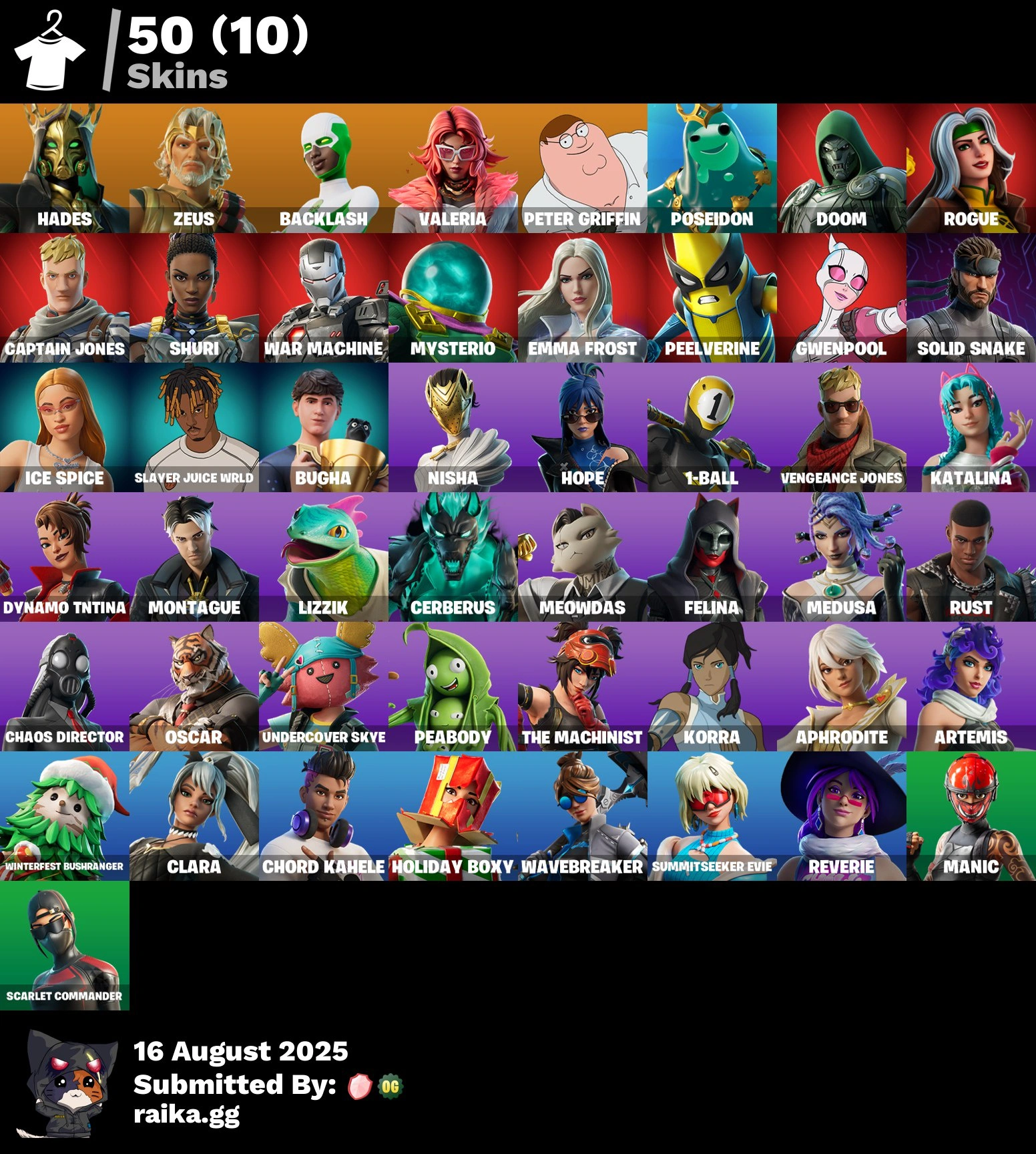 [PC/PSN/XBOX] 50 skins | Hades | Zeus | Backlash | Valeria | Peter Griffin | Poseidon | Doom | Rogue | Captain Jones | Shuri | War Machine | 150 VB