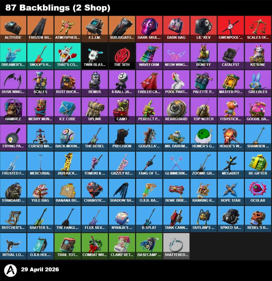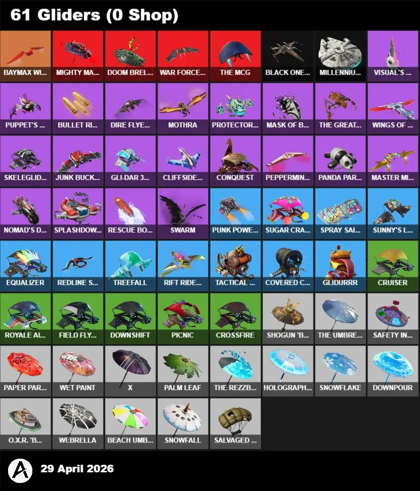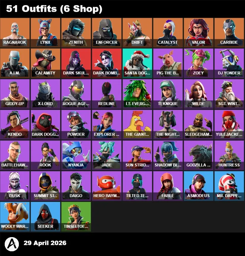 | PC/PSN/XBOX | 51 Skins | Ragnarok | Santa Dogg | Lynx | Zenith | Enforcer | Drift | Catalyst | Valor | Carbide | A.I.M. | Calamity | Dark Skully | Dark Bomber | Pig the Butcher | Zoey | DJ Yonder