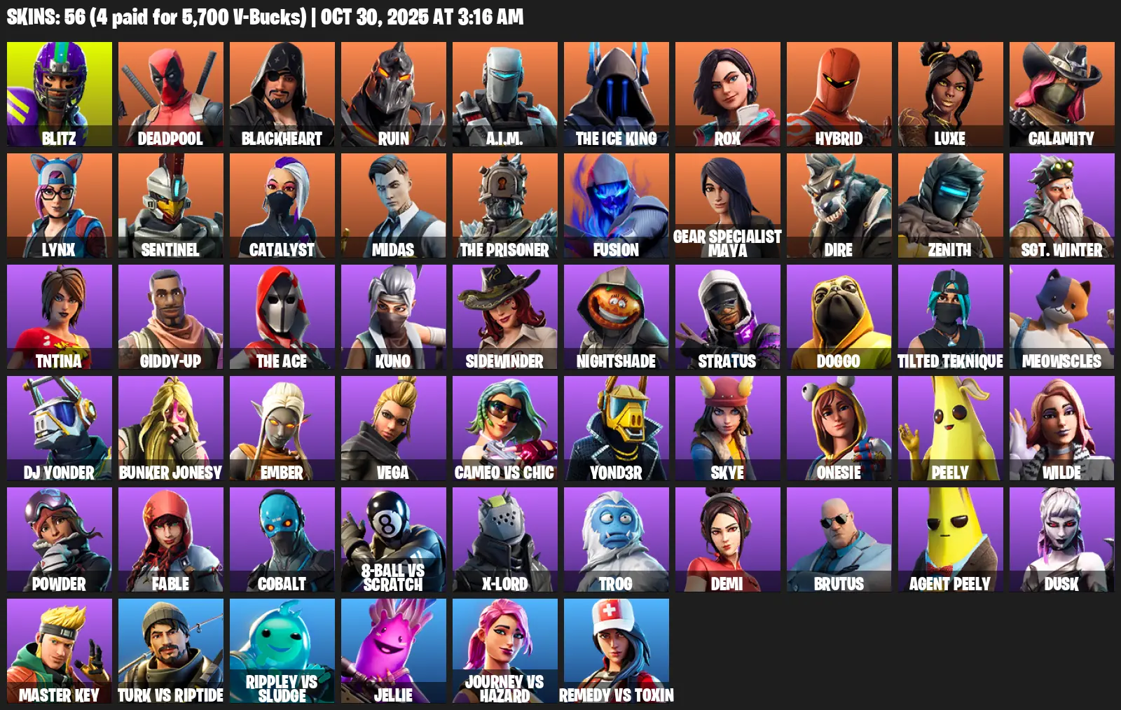 [PC/PSN/XBOX] | 56 skins | 1000 V-bucks | Blitz | Deadpool | Blackheart | Ruin | A.I.M. | The Ice King | Rox | Hybrid | Luxe | #RQT6532 | #MBFN