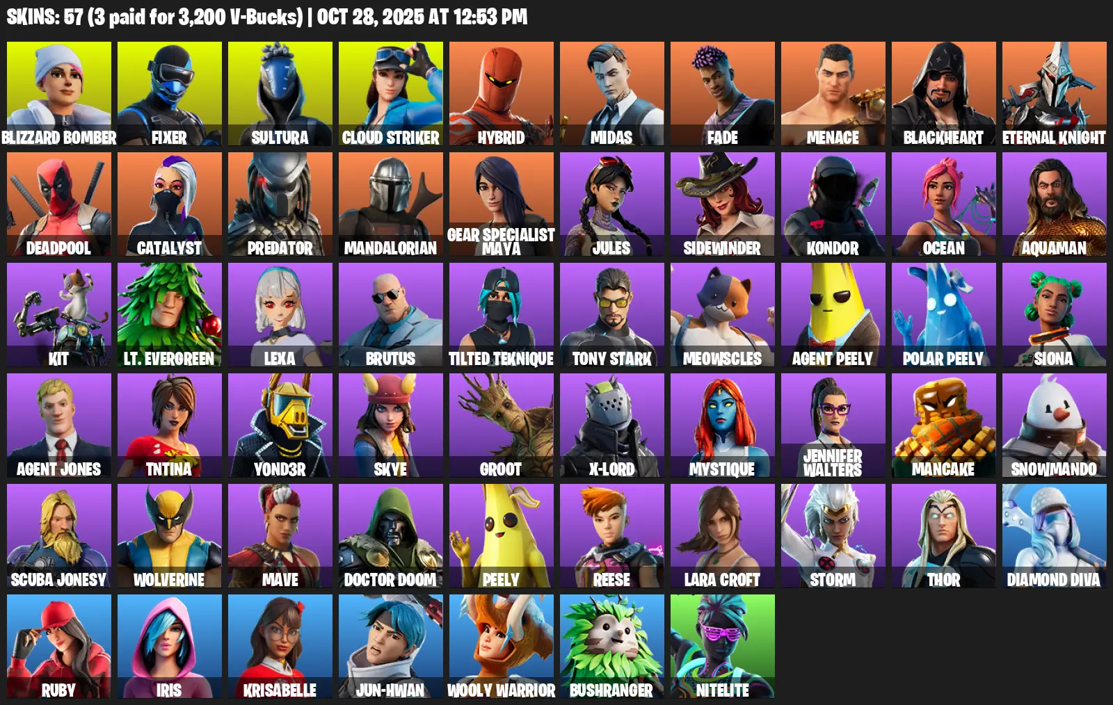 [PC/PSN/XBOX] | 57 skins | Lara Croft | Blizzard Bomber | Fixer | Sultura | Cloud Striker | Hybrid | Midas | Fade | Menace | #VNL8398 | #MBFN