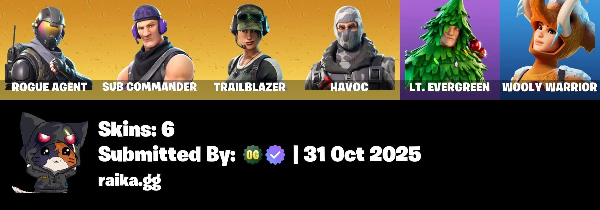 [PC/PSN/XBOX] 6 skins | Rogue Agent | Sub Commander | Trailblazer | Havoc | Lt. Evergreen | Wooly Warrior | Rust Bucket | Backup Plan | The Sith | Catalyst | 500 VBUCKS