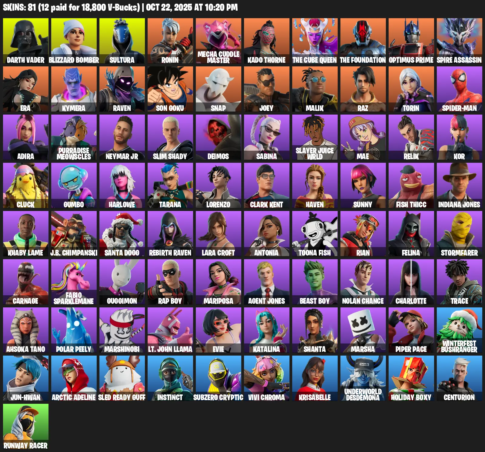 [PC/PSN/XBOX] | 81 skins | Lara Croft | Darth Vader | Blizzard Bomber | Sultura | Ronin | Mecha Cuddle Master | Kado Thorne | #TVI1298 | #MBFN