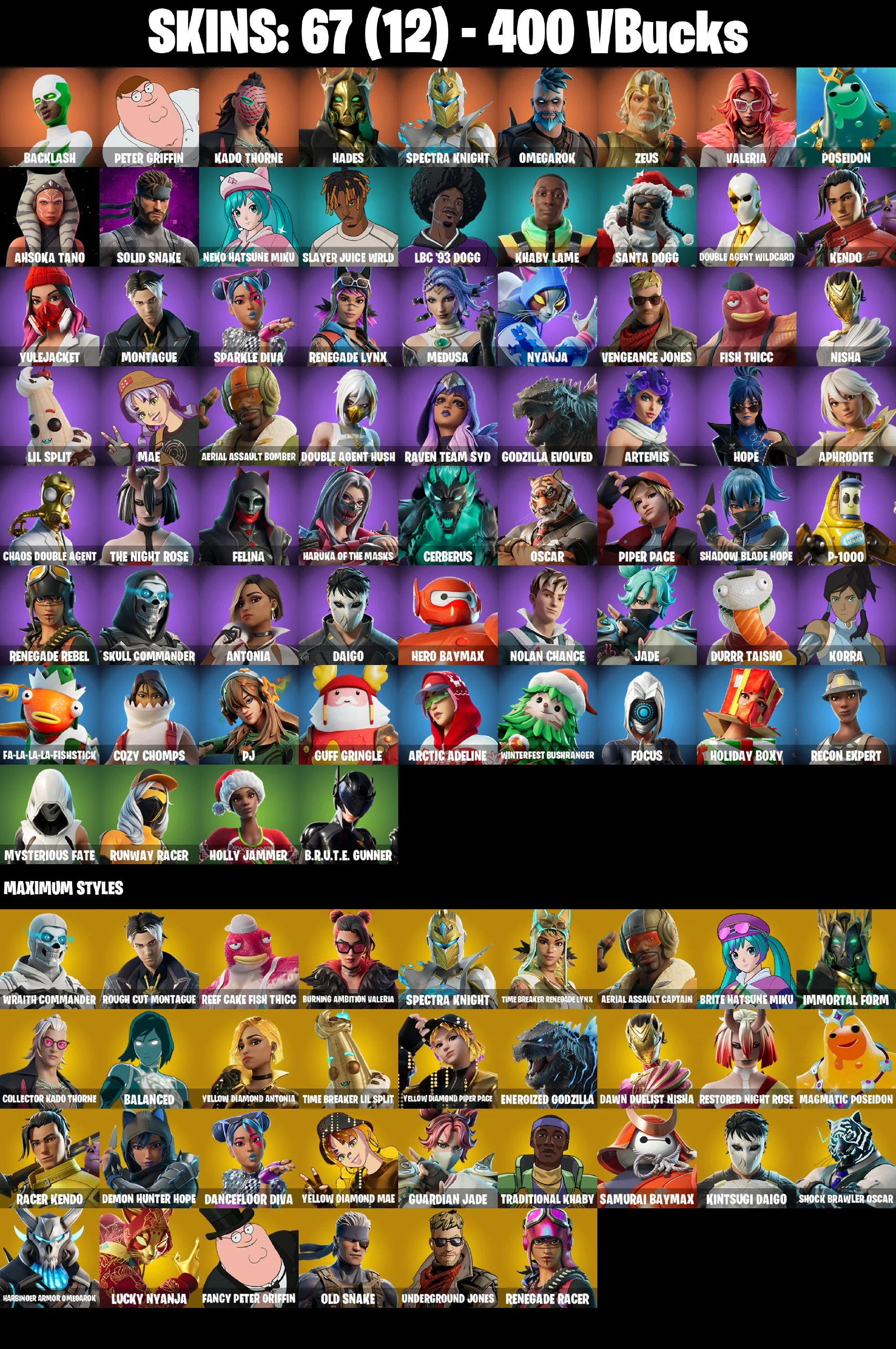 ⭐ [PC/PSN/XBOX/NINTENDO/MOBILE] 67 SKINS | BACKLASH | NEKO HATSUNE MIKU | SPARKLE DIVA | HADES | ZEUS | DOUBLE AGENT WILD CARD | PIPER PACE | P-1000 | APHRODITE | FOCUS | RECON EXPERT | HOLLY JAMMER | COZY CHOMPS | PJ | THE NIGHT ROSE | 400 VBUCKS | EMAIL
