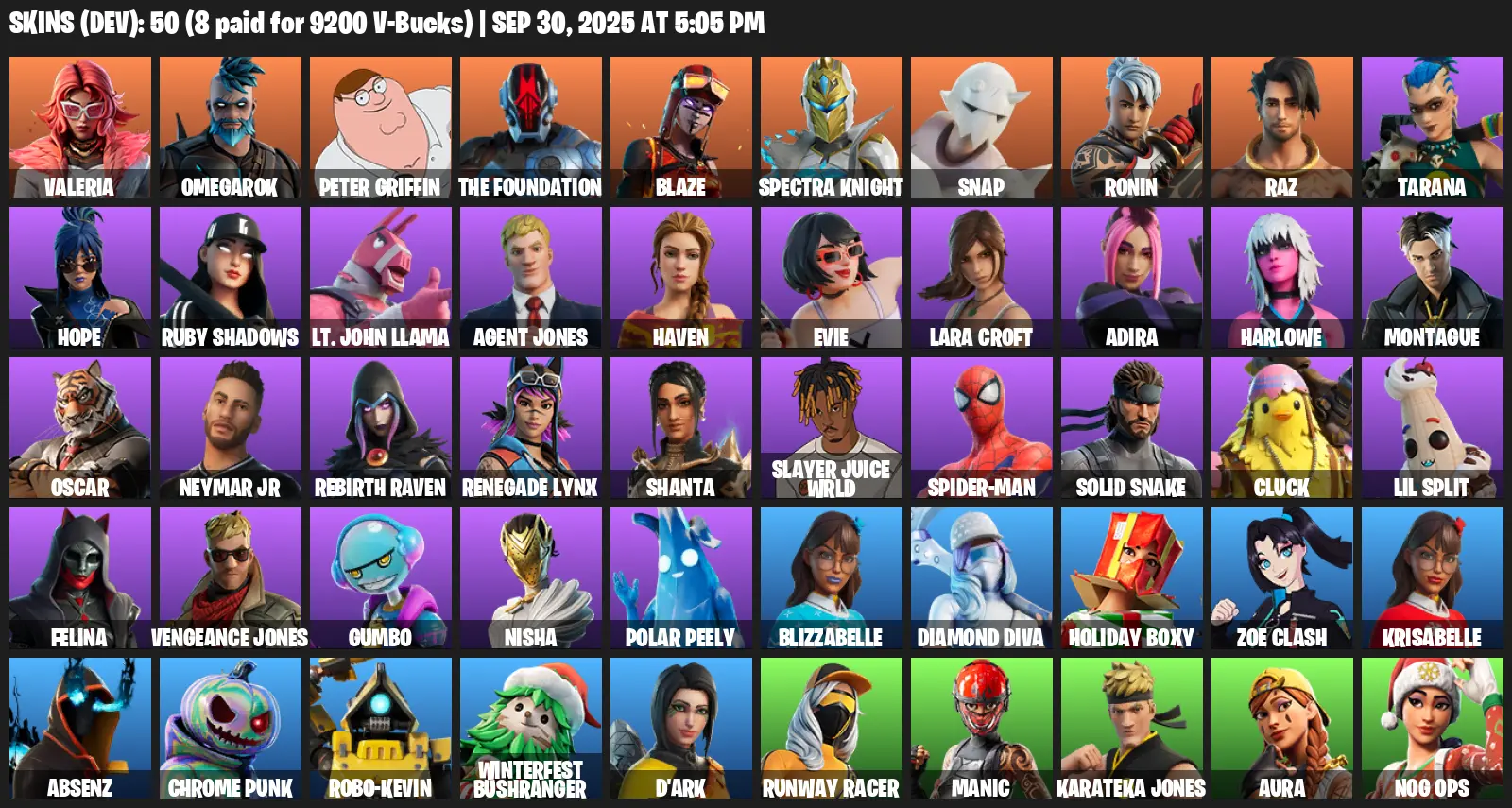 PC/XBOX/PSN 50 Skins⚡ | Lara Croft | Valeria | Omegarok | Peter Griffin | The Foundation | Blaze | Spectra Knight | Snap | Ronin | Raz | Tarana | Hope
