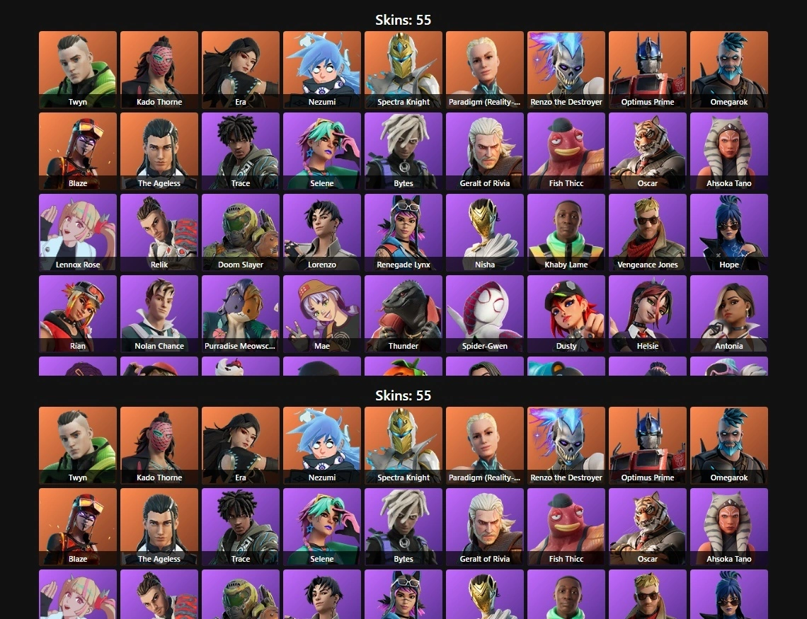 PC/XBOX/PSN 55 Skins⚡ | Twyn | Kado Thorne | Era | Nezumi | Spectra Knight | Paradigm (Reality-659) | Renzo the Destroyer | Optimus Prime | Omegarok | Blaze