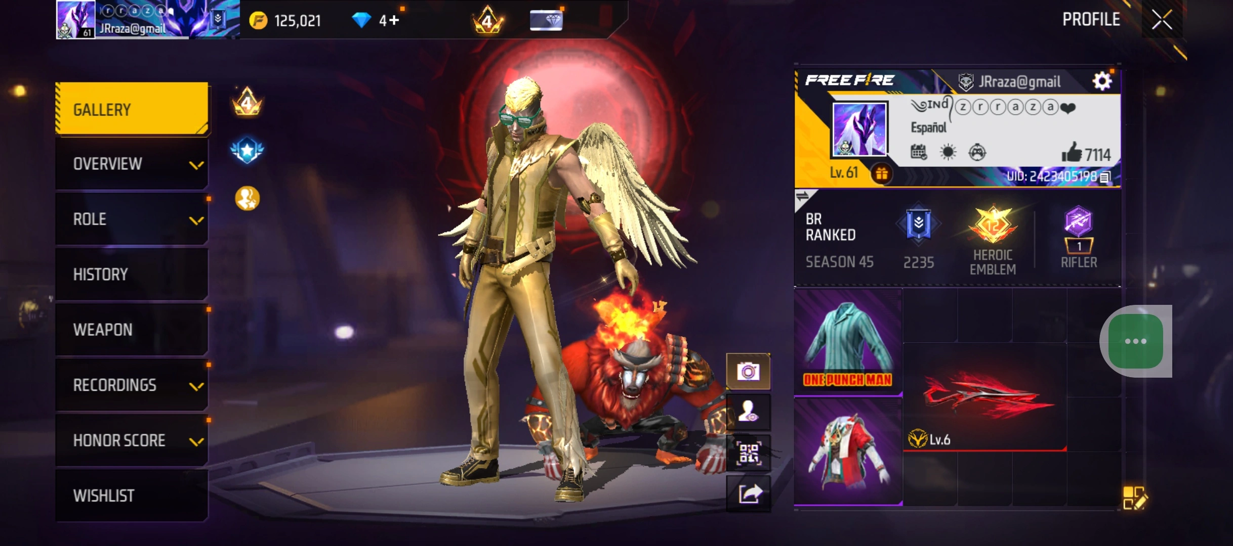FF120|LV61/337 WEAPON (1 EVO + 33 Mythic)/M1014 ⸱ Scorpio Shatter Lv. 6/335 COSTUME (1 Artifact + 19 Mythic)/43 EMOT (1 Artifact + 17 Mythic)/58 BACKPACK (2 Artifact + 23 Mythic)/12 SPORTS CAR (3 Mythic)