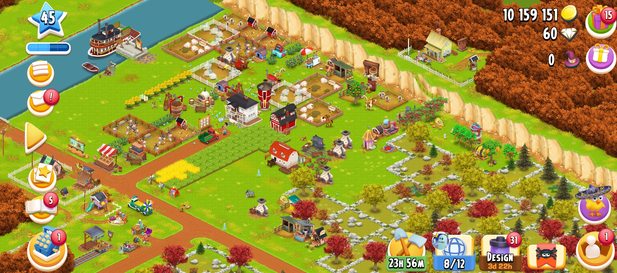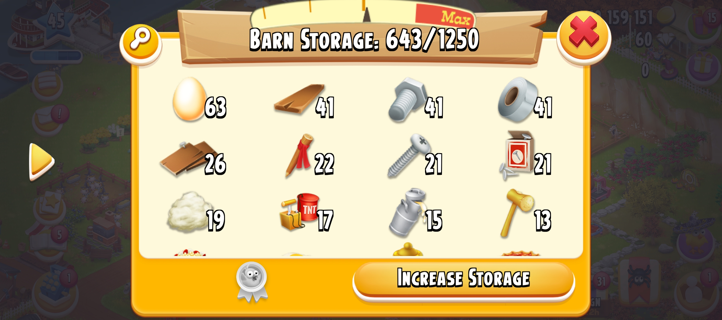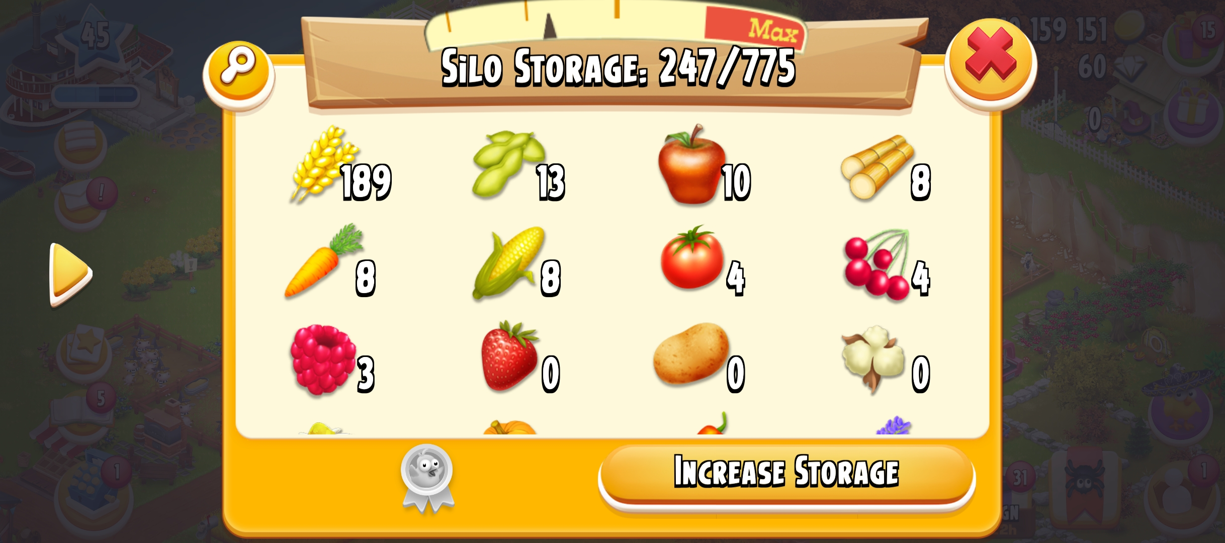 45 Level | Barn Storage 1250 | Silo Storage 775 | 10 M Coin | 60 Gems | Android & IOS