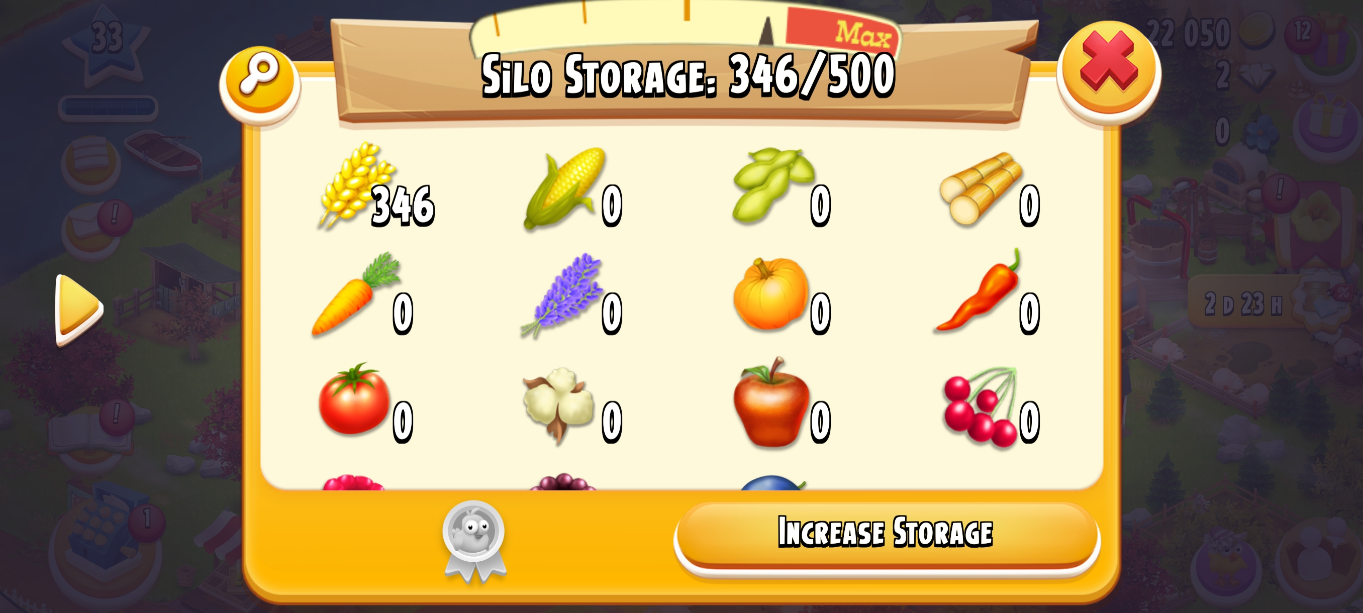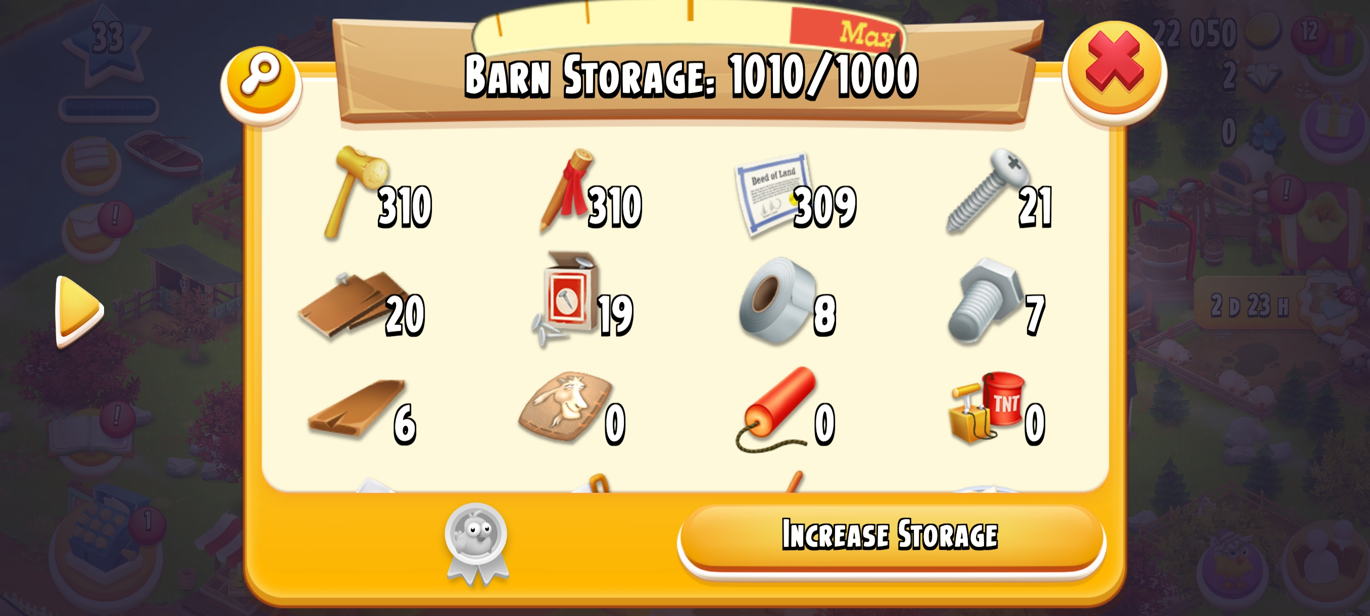 🏆 LEVEL 33 🏚️ 1000 Barn Storage🛠️ Fully Filled With Tools🌍 Main Land Open🌾 500 Silo Storage💰 22k+ Coins & 💎 2 Diamonds⚡ Instant Delivery