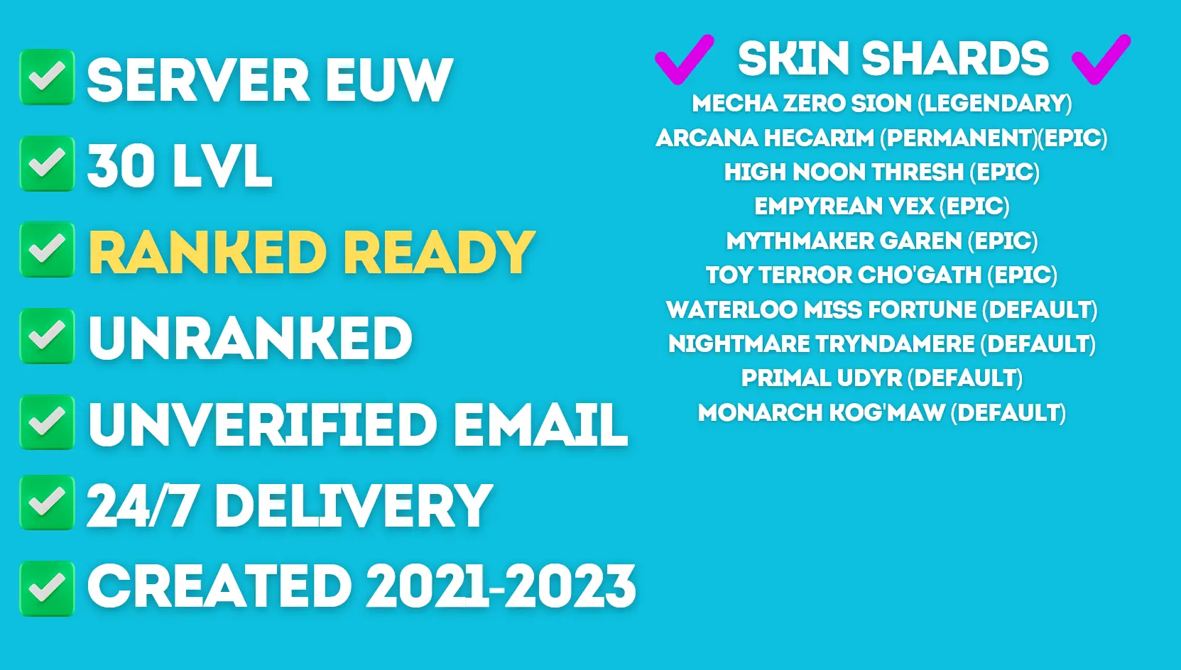 EUW 30 LvL ✅ Ranked Ready ✅ BE: 53970 ✅ Unverified ✅ Unranked ✅ Shards: Mecha Zero Sion, Arcana Hecarim, High Noon Thresh, Empyrean Vex, Mythmaker Garen, Toy Terror Cho'Gath, Waterloo Miss Fortune, Nightmare Tryndamere, Primal Udyr, Monarch Kog'Maw