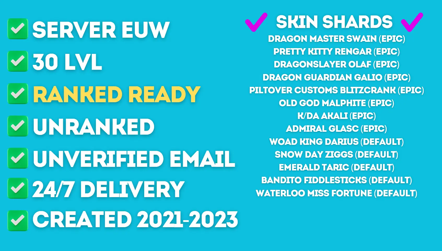 EUW 30 LvL ✅ Ranked Ready ✅ BE: 59935 ✅ Unverified ✅ Unranked ✅ Shards: Dragon Master Swain, Pretty Kitty Rengar, Dragonslayer Olaf, Dragon Guardian Galio, Piltover Customs Blitzcrank, Old God Malphite, K/DA Akali, Admiral Glasc, Woad King Darius