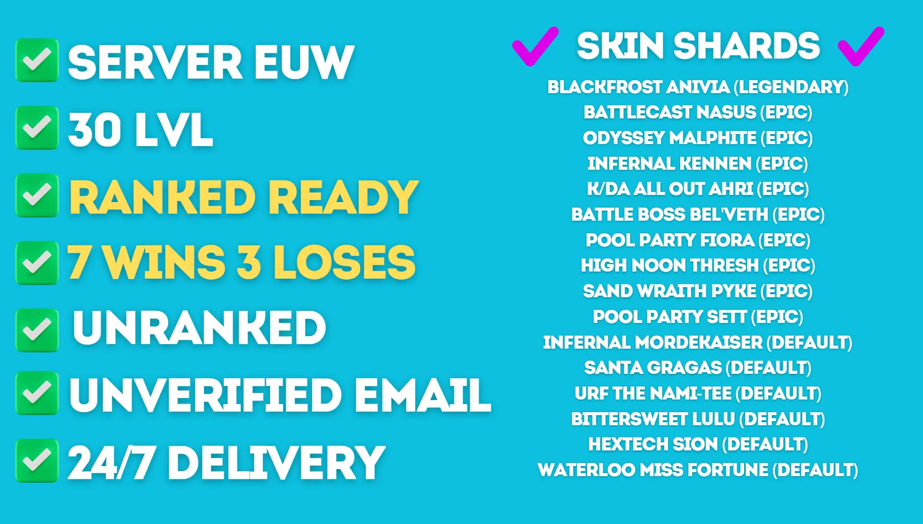 EUW 30 LvL ✅ Ranked Ready ✅ BE: 69810 ✅ Unverified ✅ Unranked ✅ Shards: BLACKFROST ANIVIA, BATTLECAST NASUS, ODYSSEY MALPHITE, Infernal Kennen, K/DA ALL OUT Ahri, Battle Boss Bel'Veth, Pool Party Fiora, High Noon Thresh, Sand Wraith Pyke, Pool Party Sett