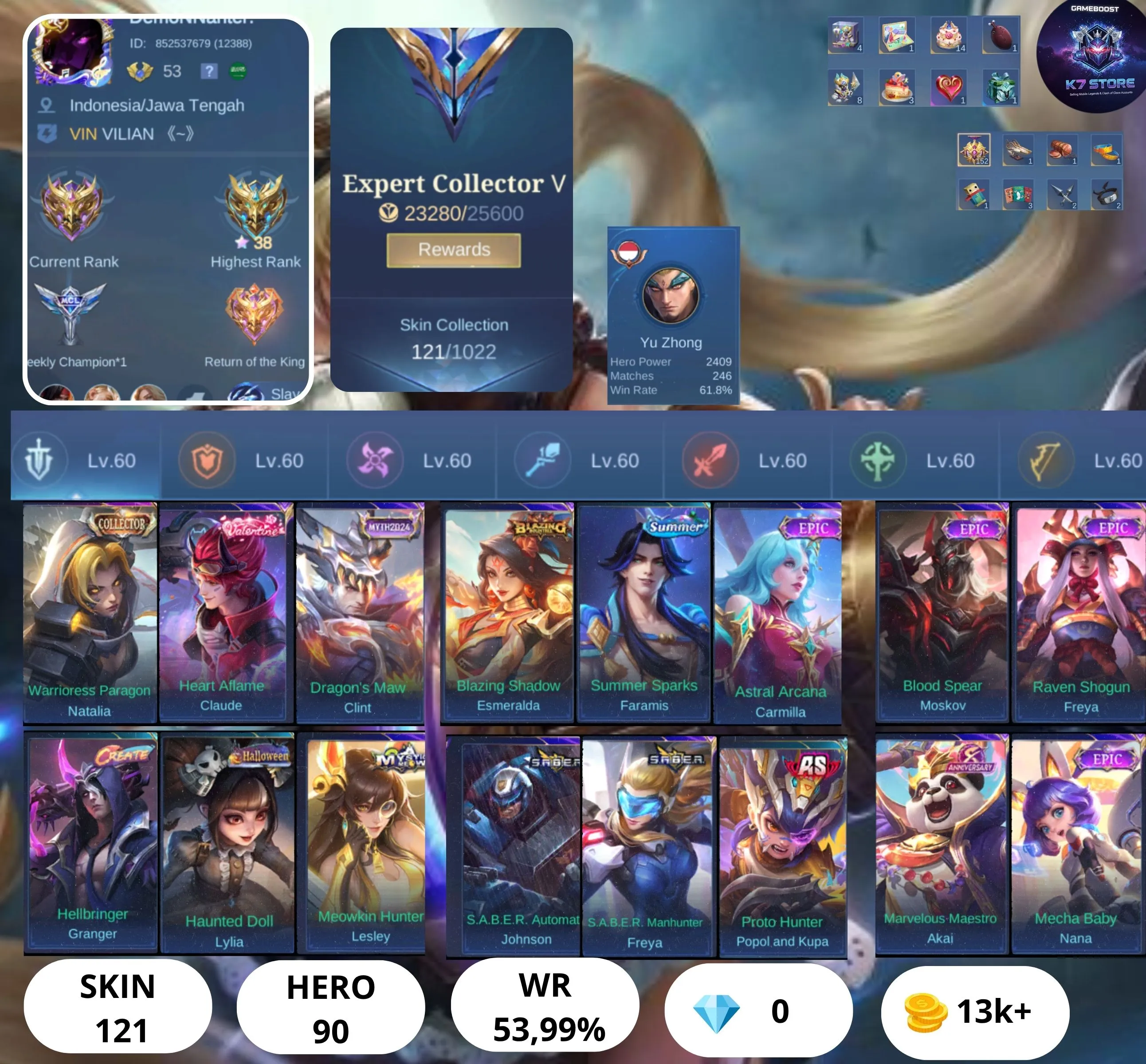 BEST MEGA DEAL✨HERO 90✨SKIN 121✨EMBLEM MAX✨ NATALIA CC✨CLAUDE VALENTINE✨CLINT MYTH✨ESME BLAZING ✨S.A.B.E.R 2 ✨FARAMIS SUMMER✨FREYA RAVEN✨CARMILA ASTRAL✨MOSKOV BLOOD✨SAFE ACC✨INSTAN DELIVERY