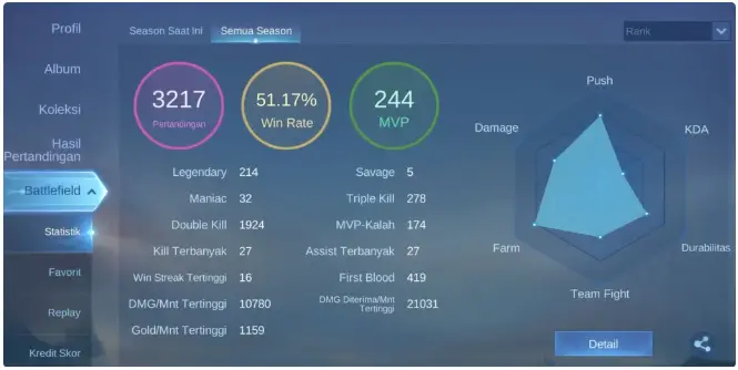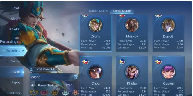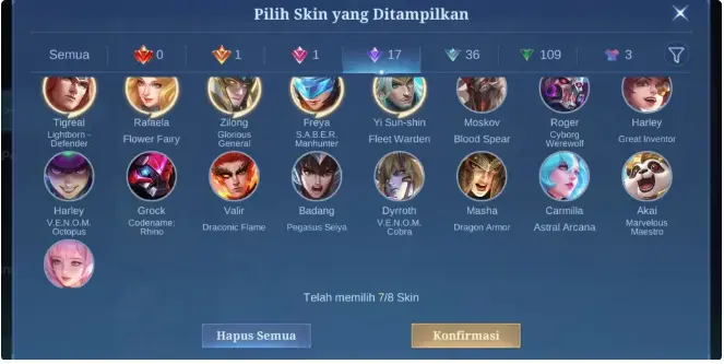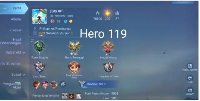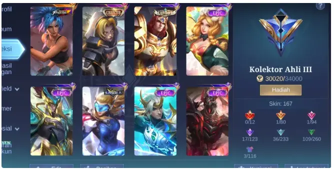 ML421 //Hero 119, Skin 167 // 1 Collab, 1 Classic, 1 Legendary, 16 Epic Skins, Epic 1 Rank