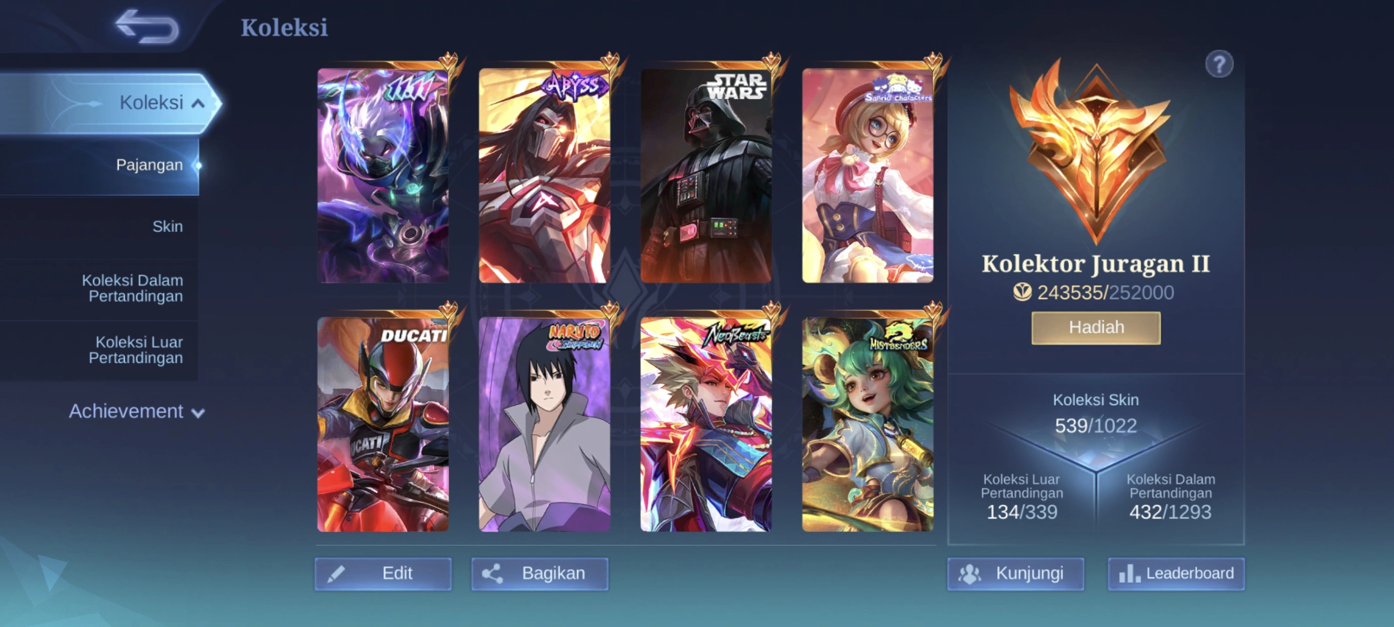 MM296|Lv107|539Skin|MEGACOLLECTORII|3LEGEND|MISTBENDERS Nana|4KOF|METROZERO Roger|FULLSOULVESSELS|ABYSS Moskov|KISHIN Lancelot|3ASPIRANTS|NARUTO Suyou|2COLLECTOR