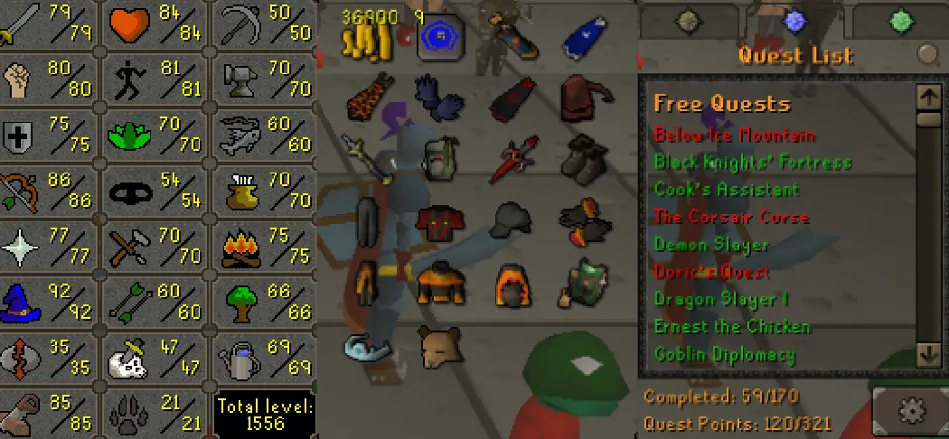 Main | 1550+ Total | 120+ QP | 80 Strength | 86 Ranged | 92 Magic | Infernal | Quiver | D Def | MA2 Cape | Skilling Outfits ⸱ CG64546-4779