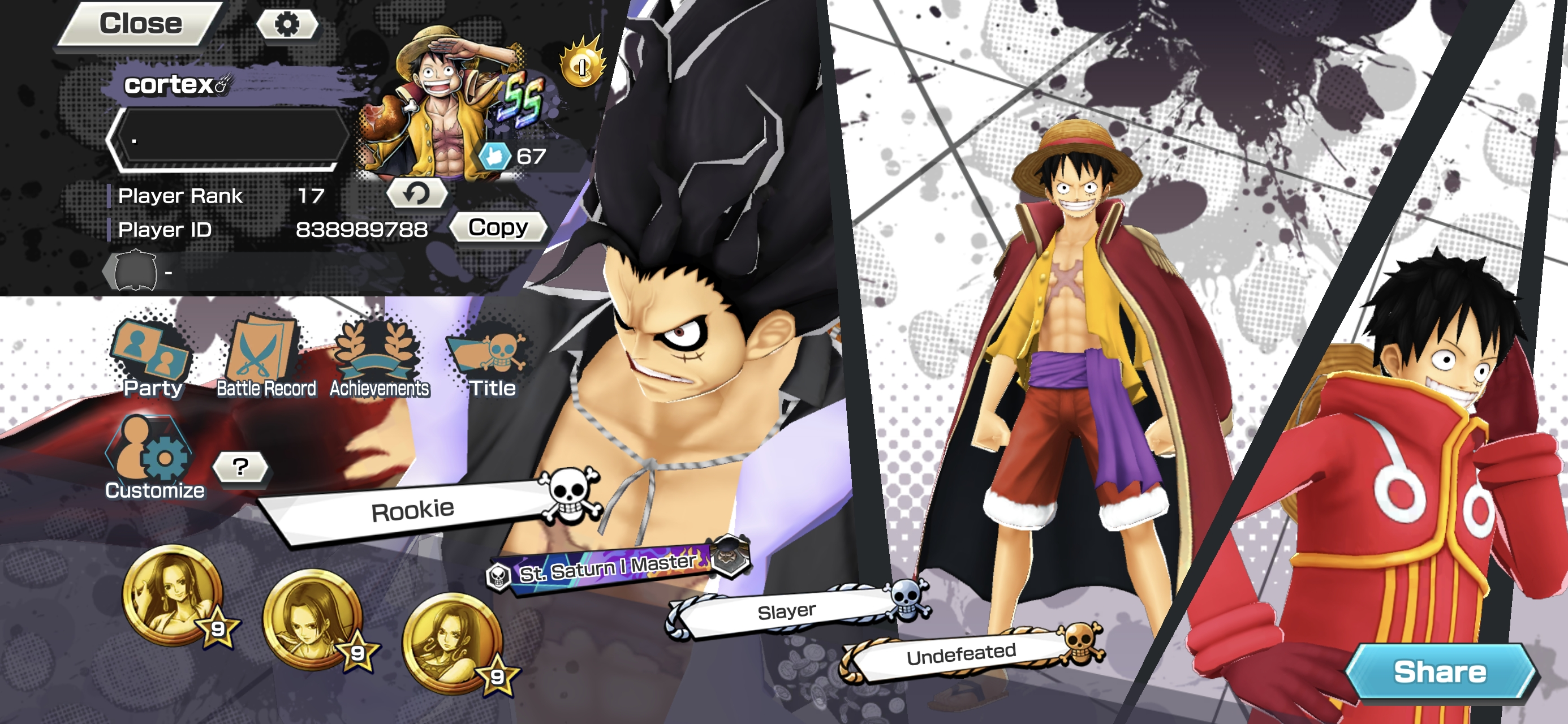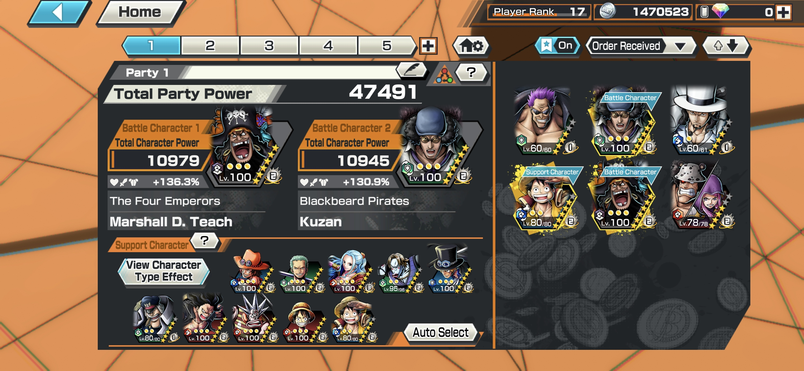 5 Ex Meta 2 Max ⸱ Marshall V2 Max ⸱ Kuzan Max ⸱ Luffy ⸱ Zephyr ⸱ Rob Lucci ⸱ Support 136 ⸱ Good Medal ⸱ Gems ⸱ Many Medal Material ⸱ B481