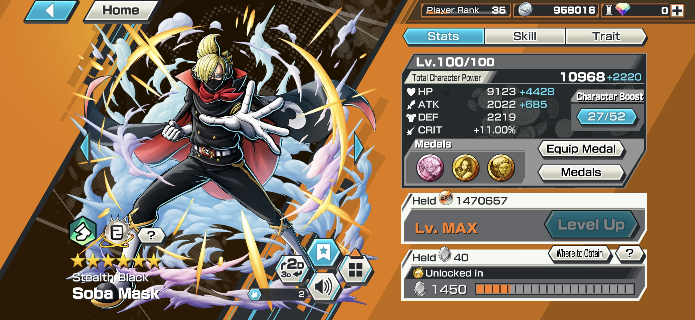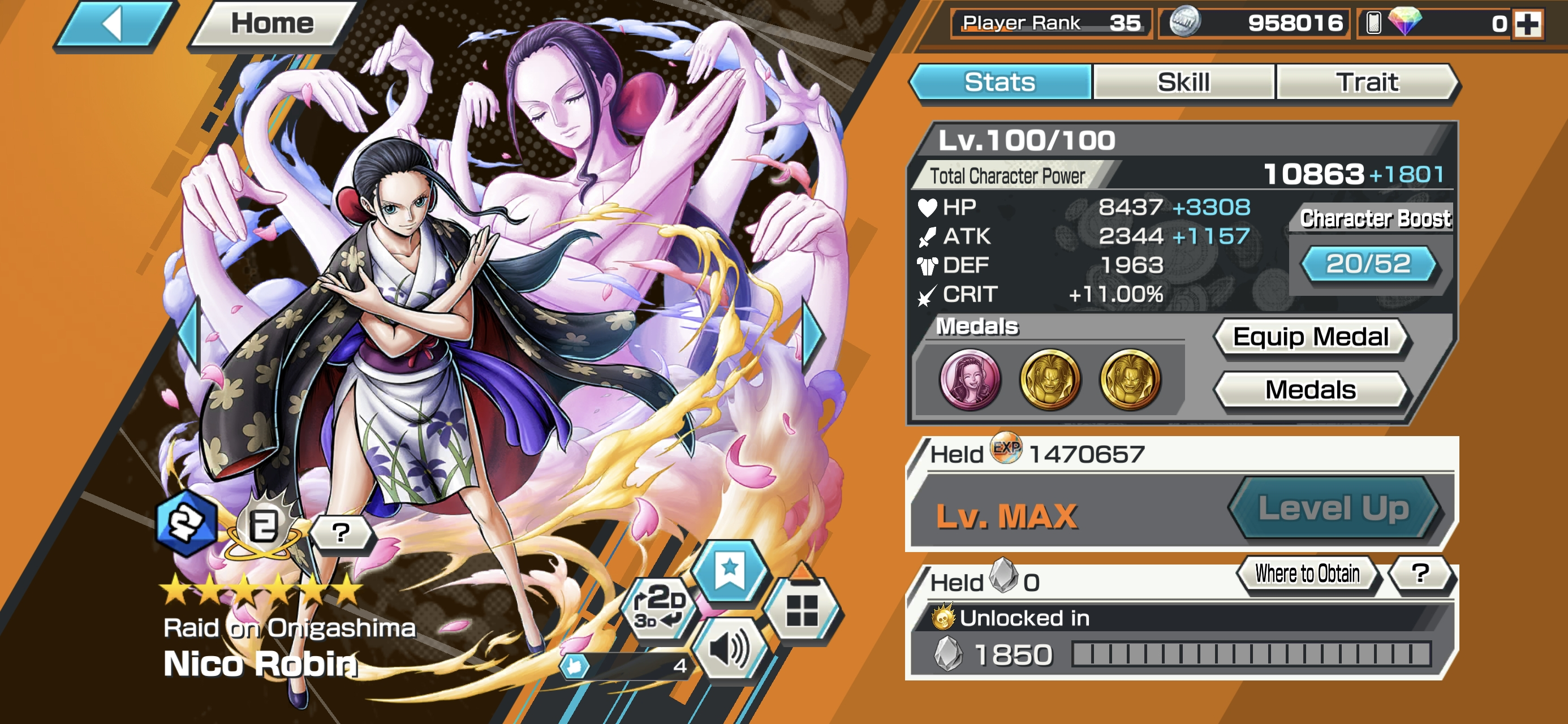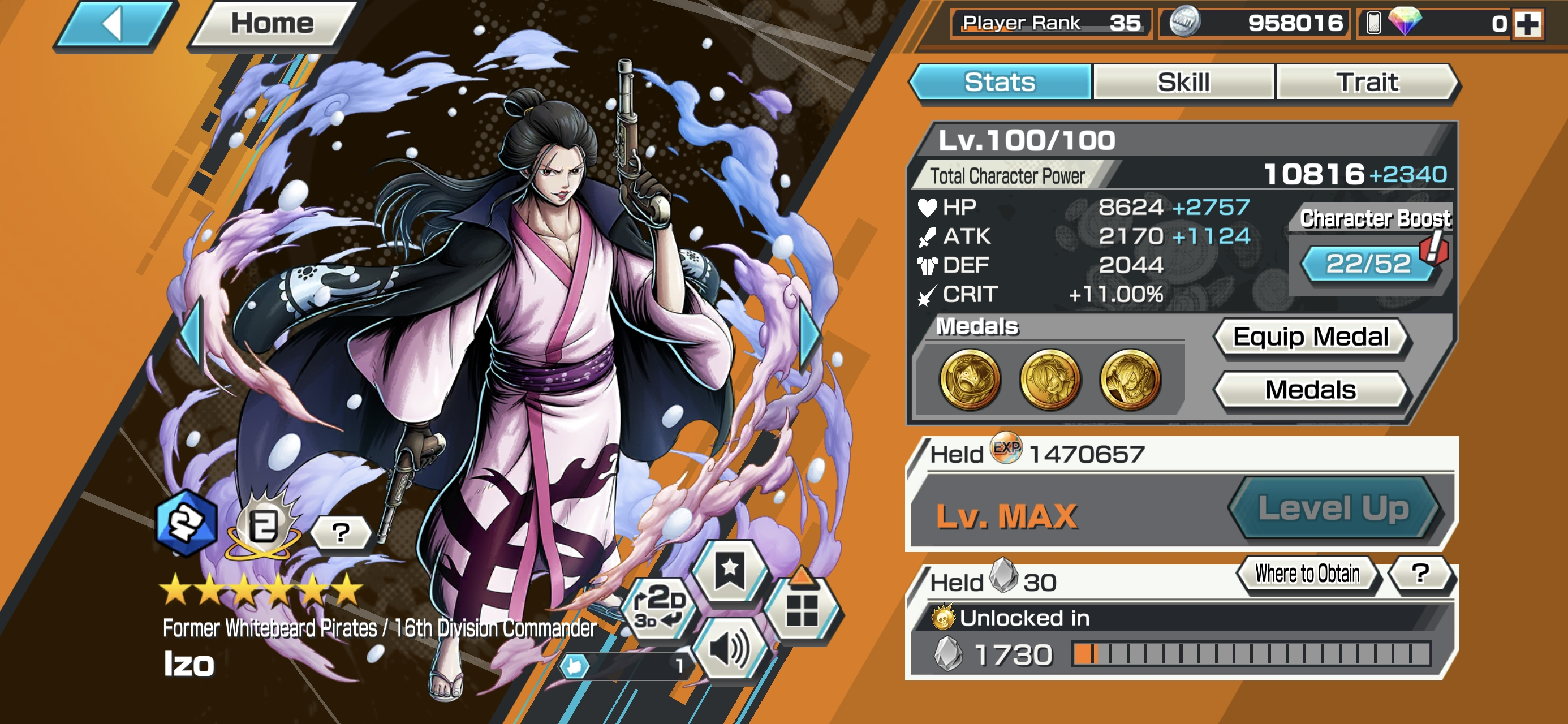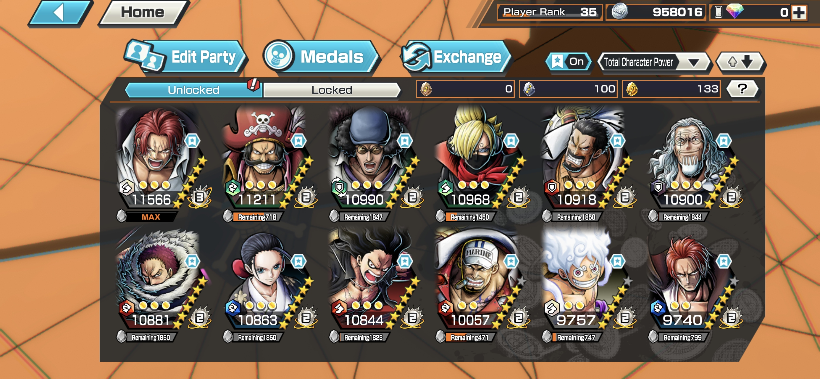 HB 16 ⸱ 6 Ex Meta 3 Max ⸱ SHANKS MAX FULL BOOST 3 ⸱ Roger Max ⸱ Kuzan Max ⸱ Akainu ⸱ Luffy ⸱ Shanks ⸱ Monkey GARP MAX ⸱ Nico Robin Max ⸱ Support 147 ⸱ Good Medal ⸱ Gems ⸱ Many Medal Material ⸱ B470