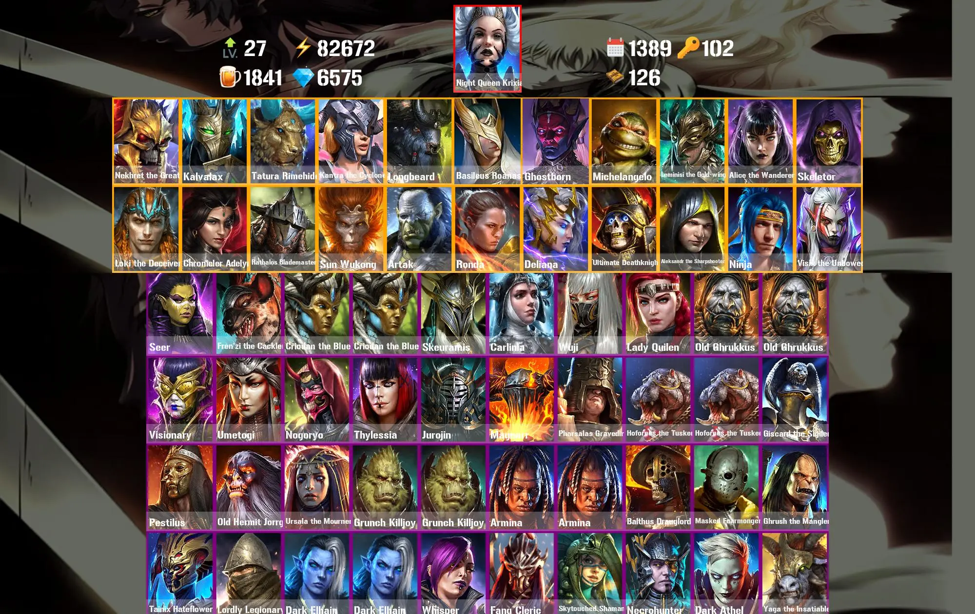 1389 Days 82.7k Energy [Mythical Starter] Night Queen Krixia ⸱ Nekhret the Great ⸱ Kalvalax ⸱ Tatura Rimehide ⸱ Kantra the Cyclone ⸱ Longbeard ⸱ Seer ⸱ Fren'zi the Cackler ⸱ 57.7m Silver ⸱ 6.6k Gems
