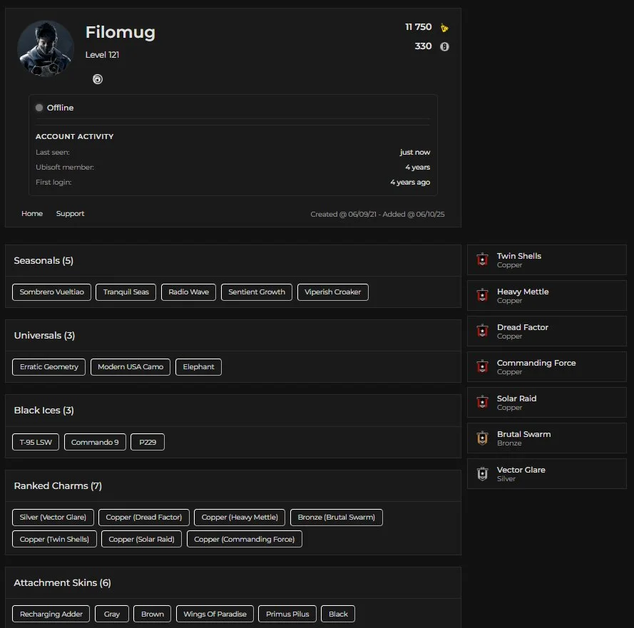 121lvl  92 Skins  69 Operators Black Ices 3  3 Universal Seasonals 5