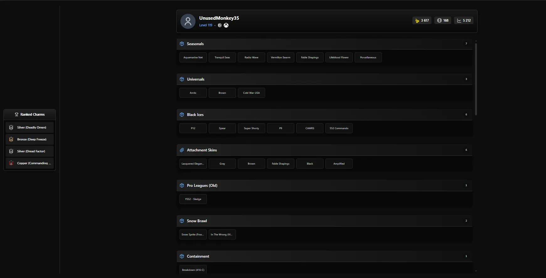 [PC/PSN] LvL: 119 | Ranked Ready | 2x Silver | Black Ice (6) | Seasonal (7) | Universal (3) | Pro Leagues (Old) (1) | Legendary Skins (5) | x Operator | 3k Renown #R12