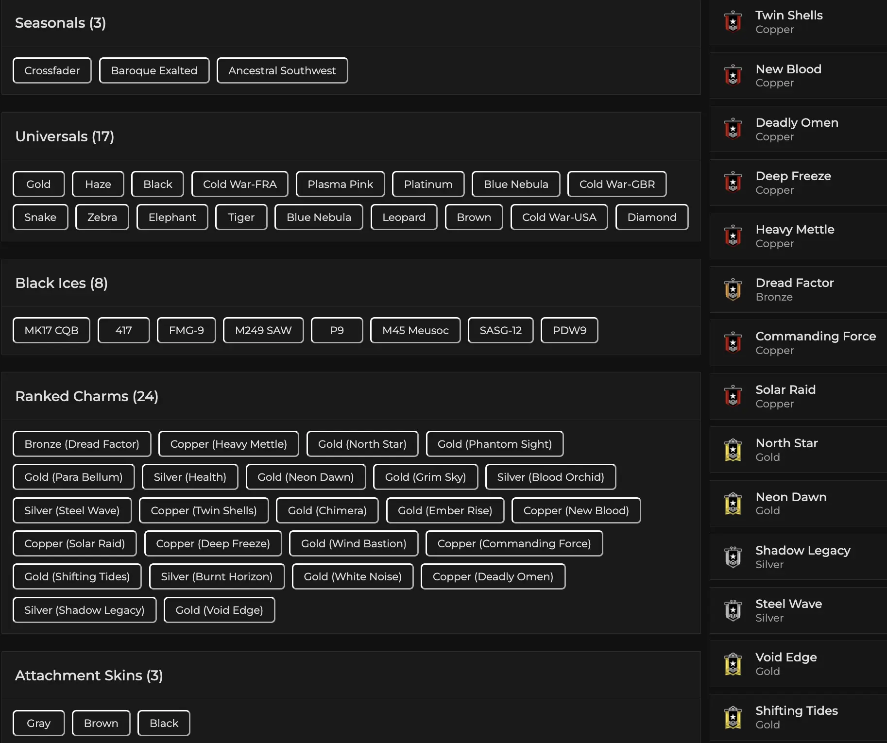 🧲 [PC/STEAM] Ranked Ready | Level 174 | Blue Nebula | 8x Black Ice | 17x Universal | 11x Gold Charm | 3x Seasonal | Crossfader | 7x Pro League | 3x Elite | Pilot Programs | 60 Operators | 25,372 Renown