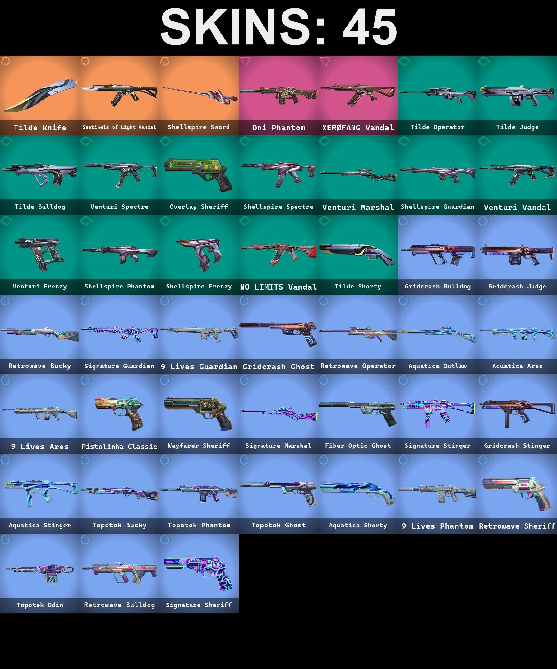 45 SKINS | 2 KNIFE | XEROFANG VANDAL | ONI PHANTOM | SENTINELS OF LIGHT VANDAL | TILDE KNIFE | SHELLSPIRE SWORD | TILDE OPERATOR | TILDE JUDGE | TILDE BULLDOG | VENTURI SPECTRE | OVERLAY SHERIFF | SHELLSPIRE SPECTRE | VENTURI MARS