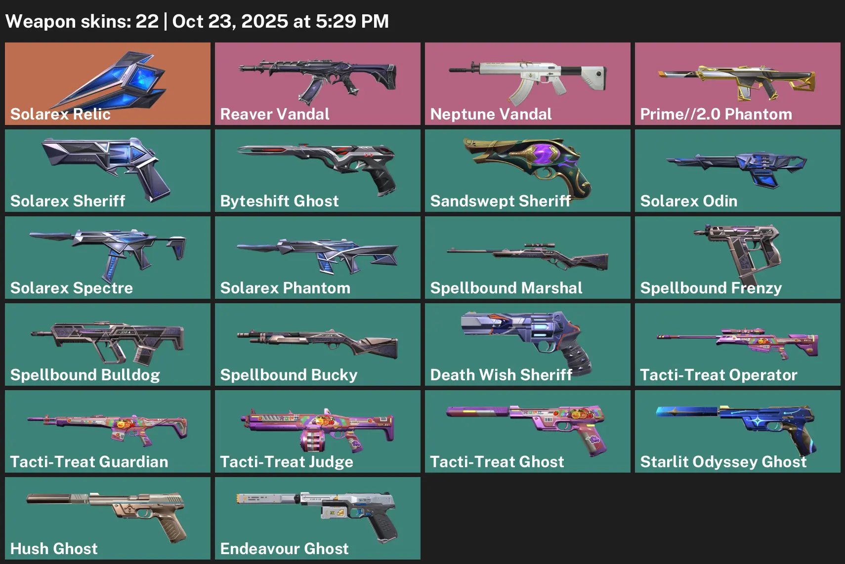 🪀 AP ⚾️ Silver 2 🛻 22 Skins 🍶 210 VP 🫛 21 Agents 🫴 Value: 6200 VP 🕯 Solarex Relic 😦 Reaver Vandal 🩲 Neptune Vandal 🤙 Prime//2.0 Phantom 🧋 Solarex Sheriff 🥺 Byteshift Ghost