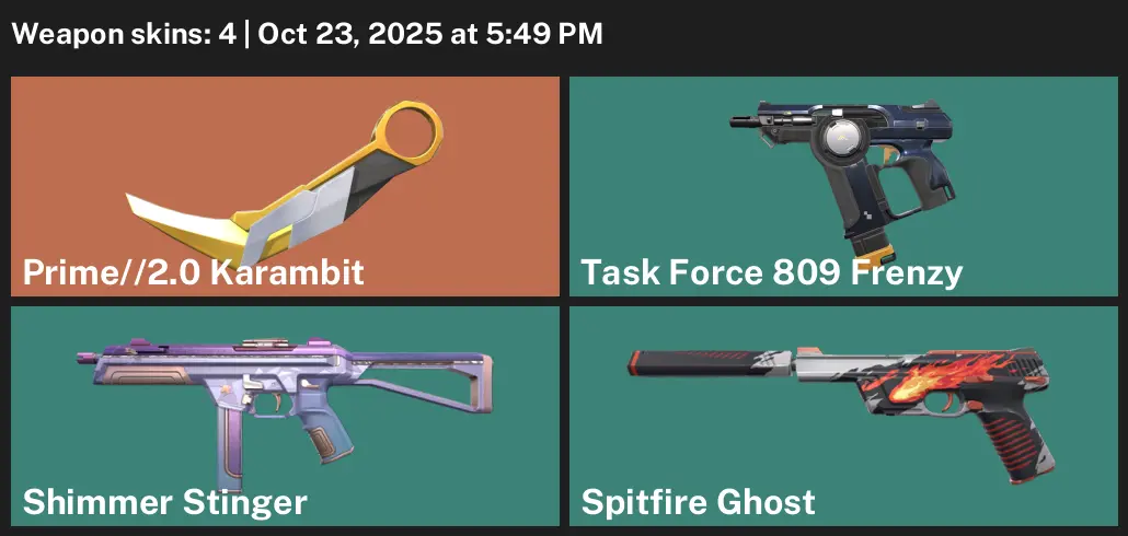 📥 AP 👡 Unranked 🌹 4 Skins 🏸 34 VP 📔 1 Agents 🤜 Value: 3550 VP 🏦 Prime//2.0 Karambit 🛩 Task Force 809 Frenzy 🙂 Shimmer Stinger 🎏 Spitfire Ghost