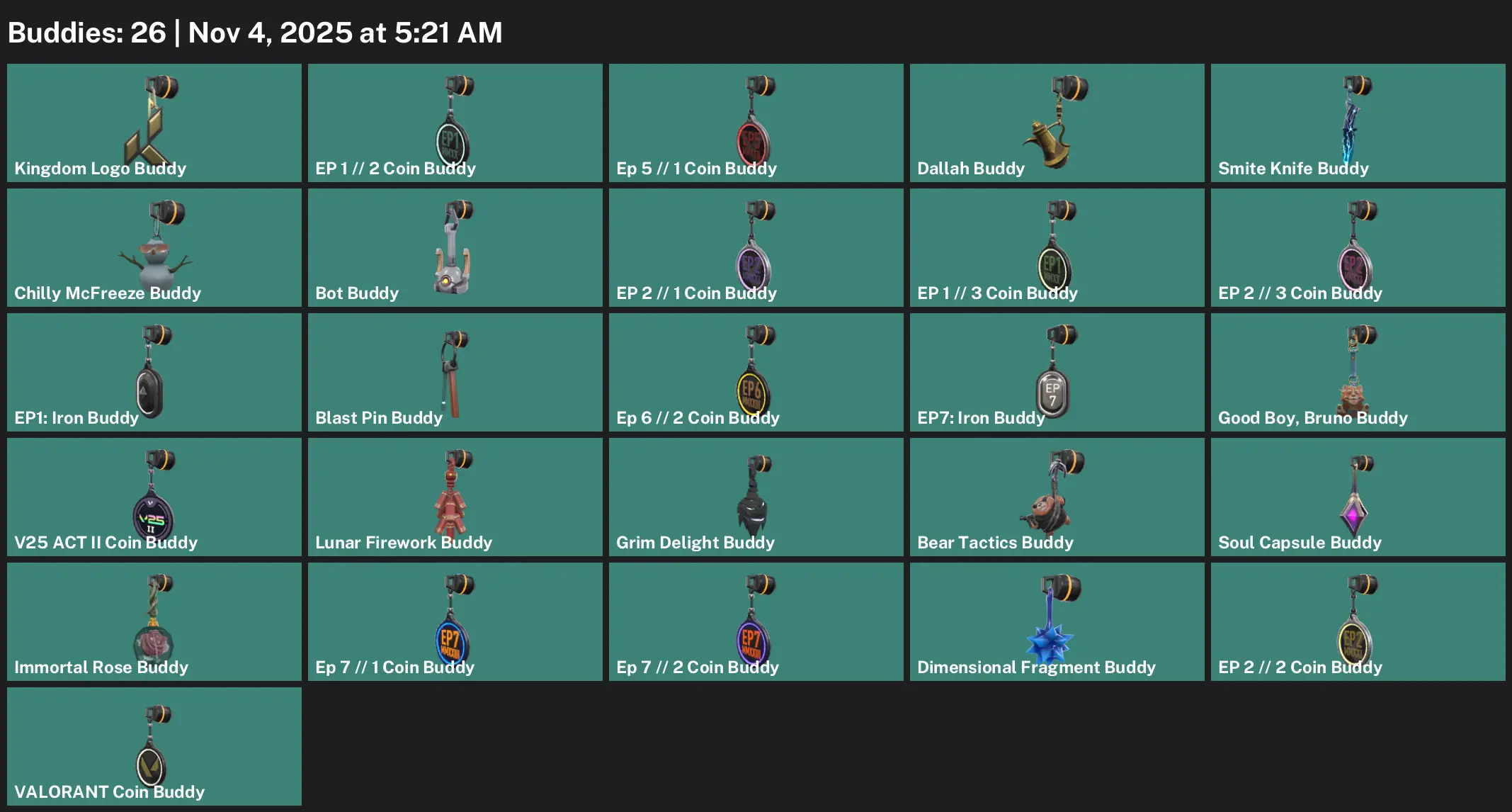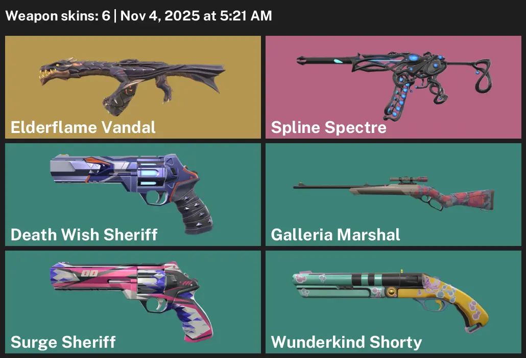 ๐งฐ AP ๐ Unranked ๐ฒ 6 Skins ๐ข 193 VP ๐๏ธ 7 Agents ๐ผ Value: 5125 VP ๐ Elderflame Vandal ๐ค Spline Spectre ๐ Death Wish Sheriff ๐ซ Galleria Marshal โ๏ธ Surge Sheriff ๐  Wunderkind Shorty