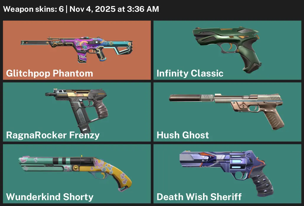 Value: 2175 VP ๐ Glitchpop Phantom ๐คฃ Infinity Classic ๐ RagnaRocker Frenzy ๐ Hush Ghost ๐ซ Wunderkind Shorty ๐ Death Wish Sheriff