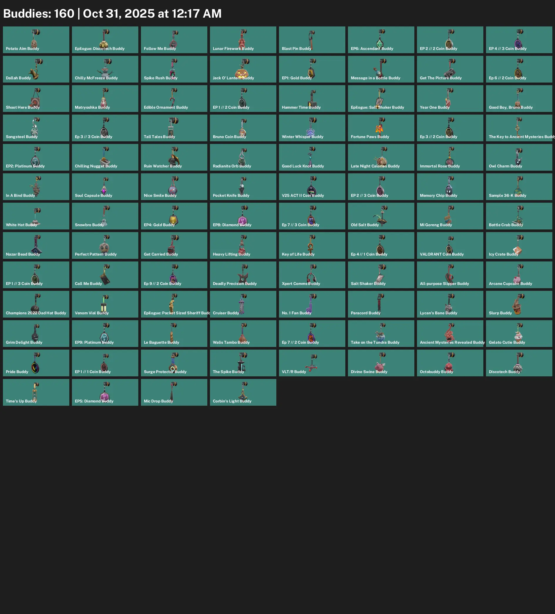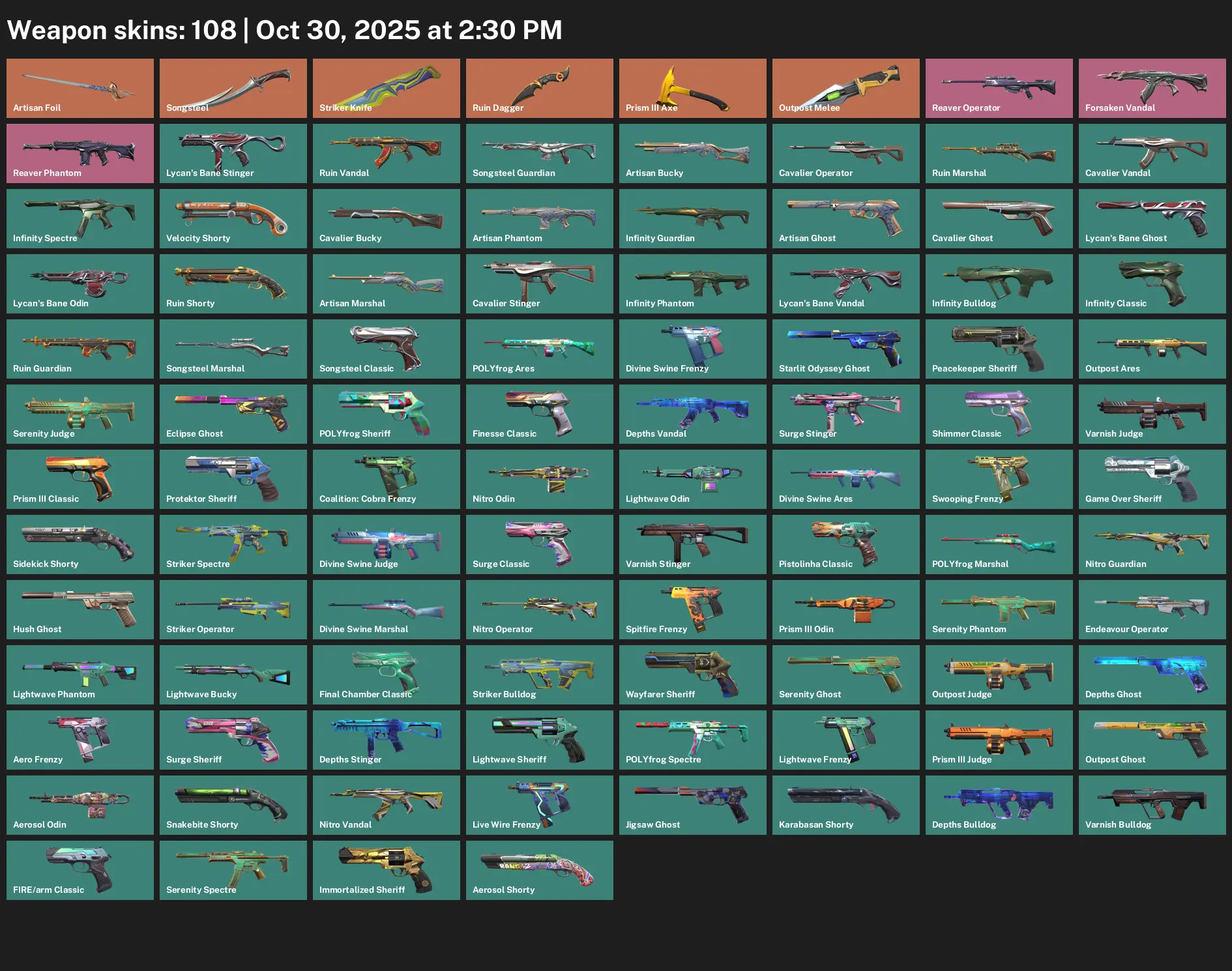 🫛 BR 🎄 Unranked 🍭 108 Skins 🧘♀️ 132 VP 🚿 21 Agents 🪘 Value: 6200 VP 🧘♀️ Artisan Foil 🪐 Songsteel ⏱ Striker Knife 🎩 Ruin Dagger 🍯 Prism III Axe 🚌 Outpost Melee