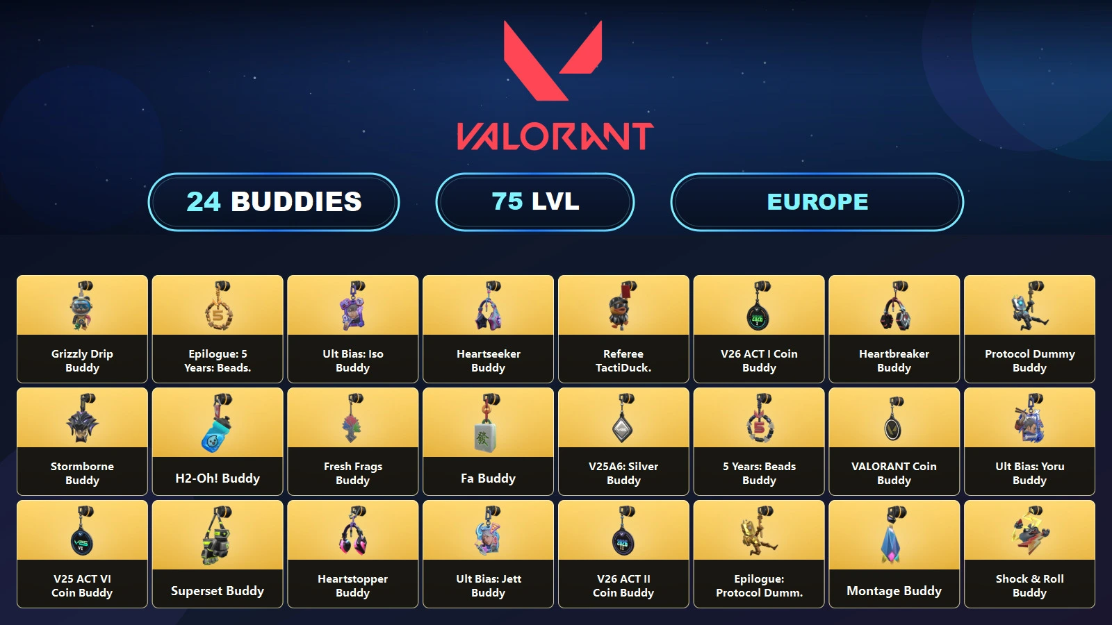 EU 🎯 34 Skins 🍒 75 Level ⛈ Spectrum Phantom 🥪 Kuronami Spectre 🪐 Reaver Operator 🐩 Reaver Sheriff 🏁 Mystbloom Fanblade 🎪 EX.O Vandal 🪙 Solarstride Vandal 🧊 Gold 1 🔥 16 Agents