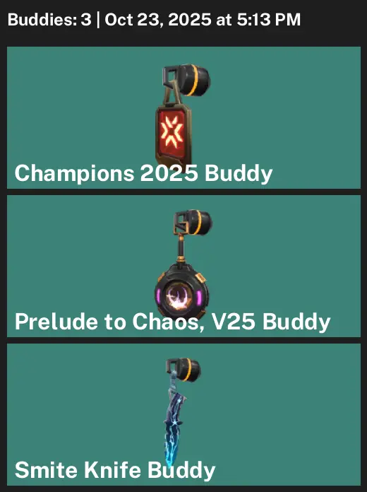 🩻 EU 🎙 Unranked 🍛 7 Skins 🤧 2910 VP 🪕 0 Agents 😾 Value: 21075 VP 🦦 Prelude to Chaos Sheriff 💫 Prelude to Chaos Bulldog 🍣 Champions 2025 Vandal 😮 Prelude to Chaos Phantom 📙 Prelude to Chaos Spectre ⚓️ Flail of Chaos