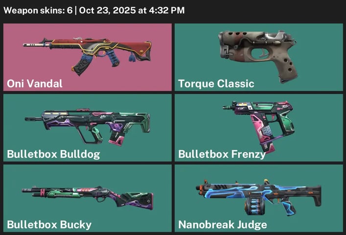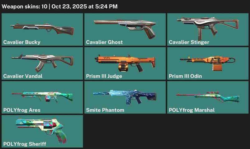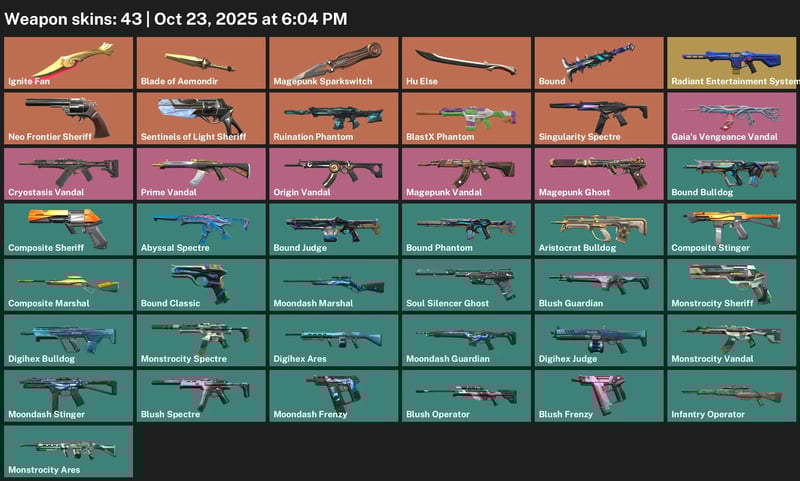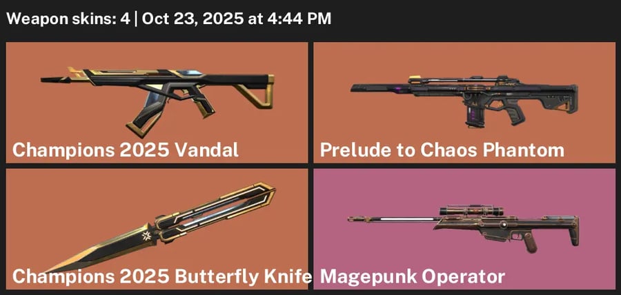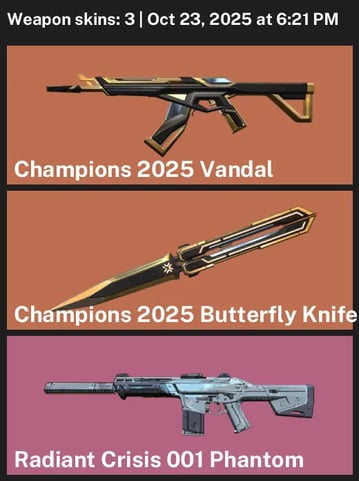 💪 NA 🌋 Unranked ✋ 2 Skins 🥜 0 VP 🧅 6 Agents 🪳 Value: 8025 VP 🫨 Champions 2025 Vandal 🪑 Champions 2025 Butterfly Knife