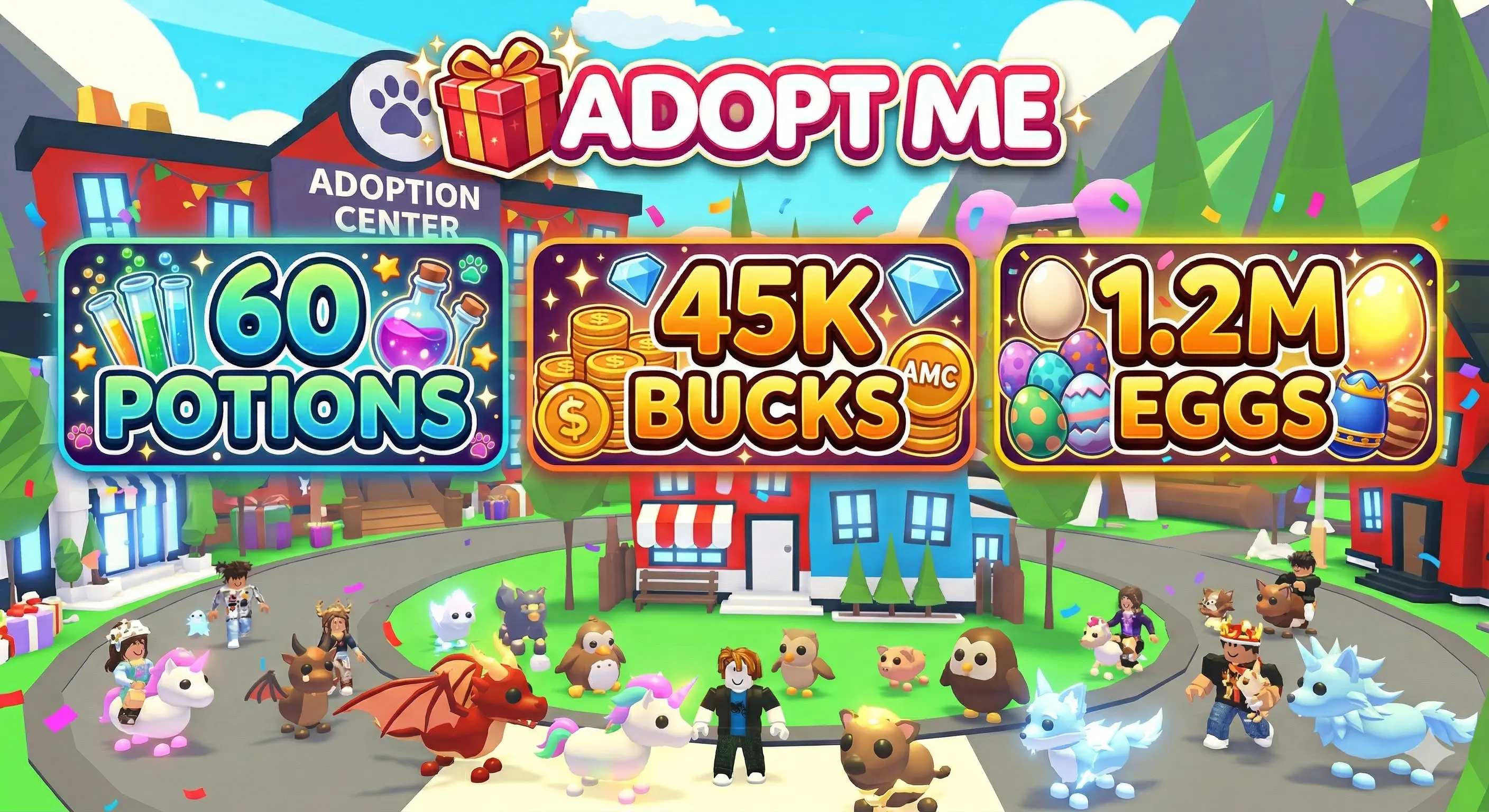 🎁 Adopt Me | 🧪 60 Potions | 💎 45K Bucks | 🥚 1.2M Eggs