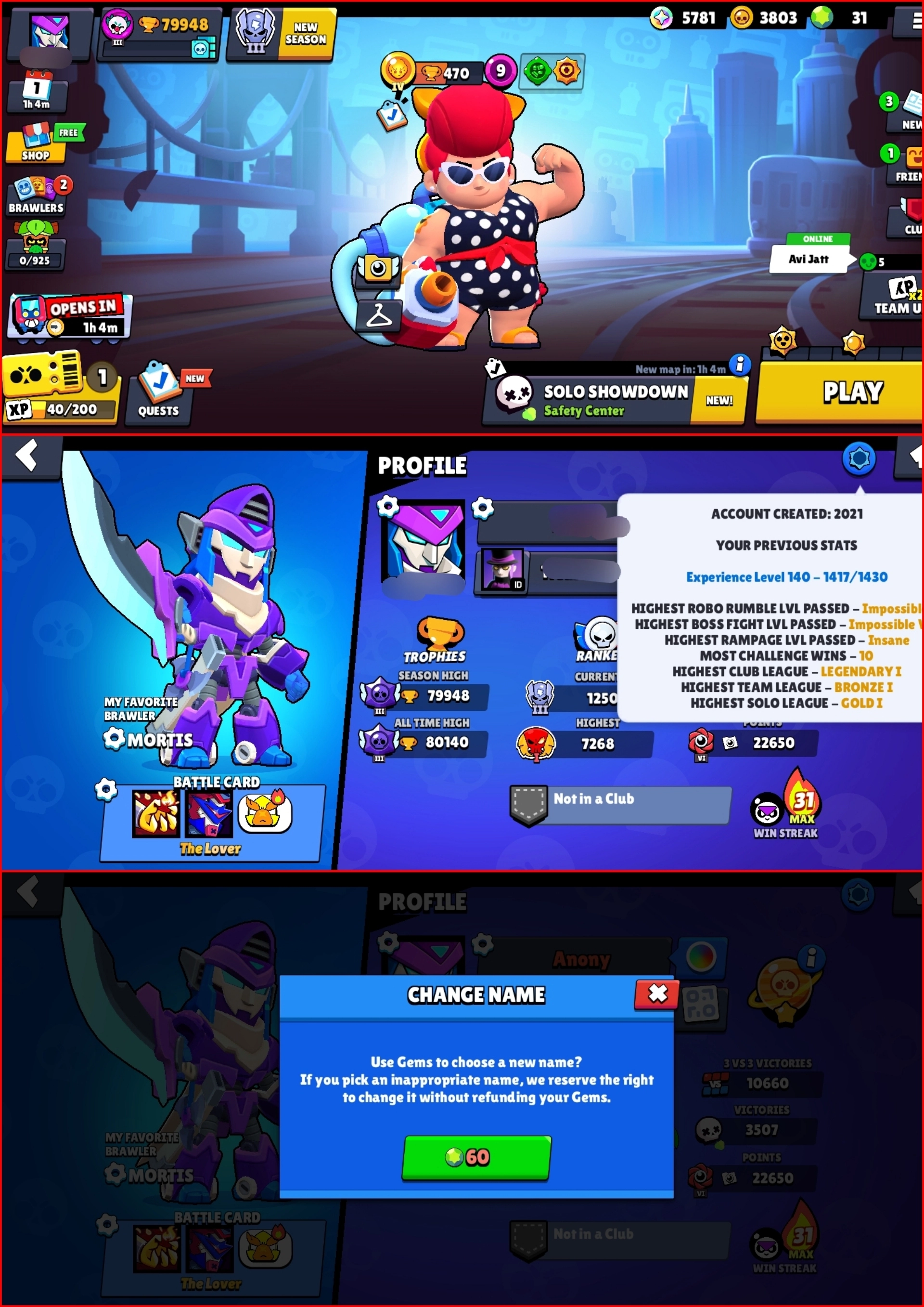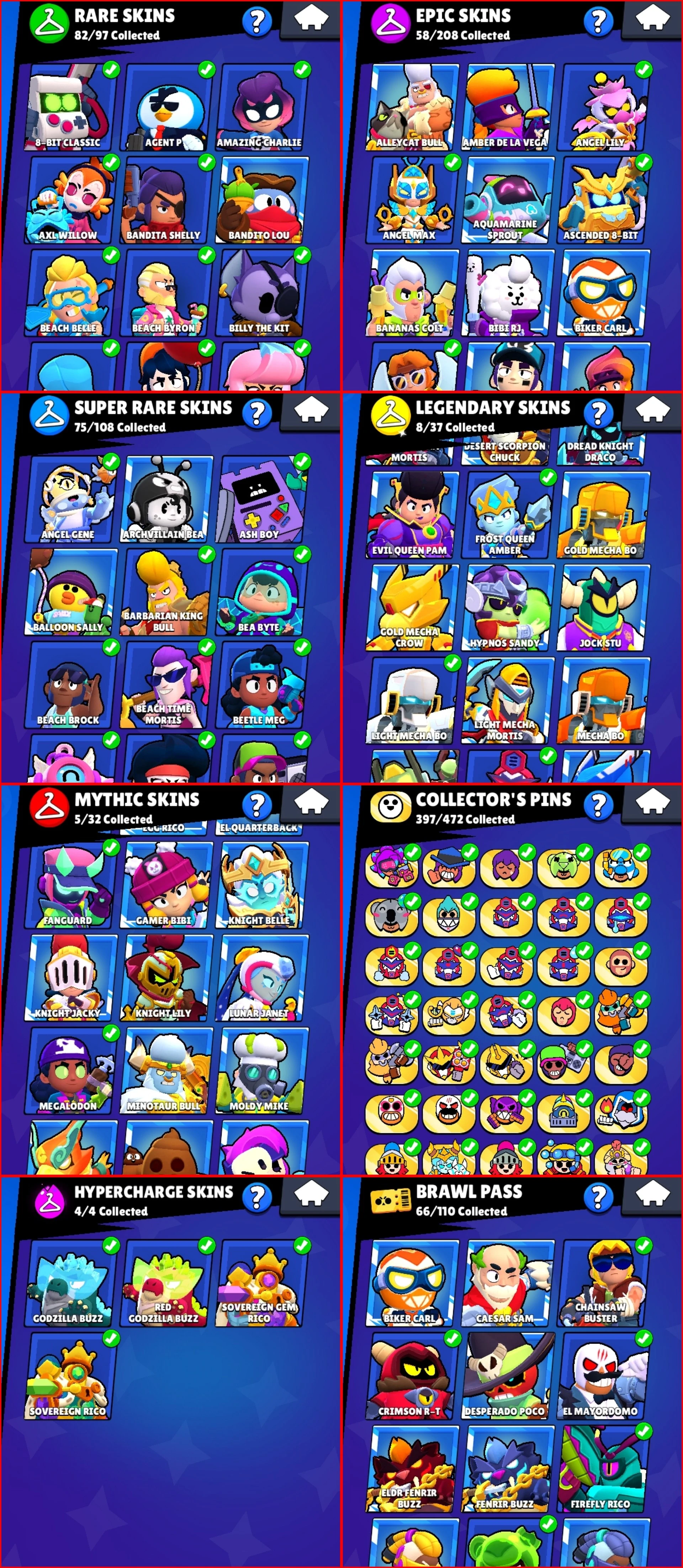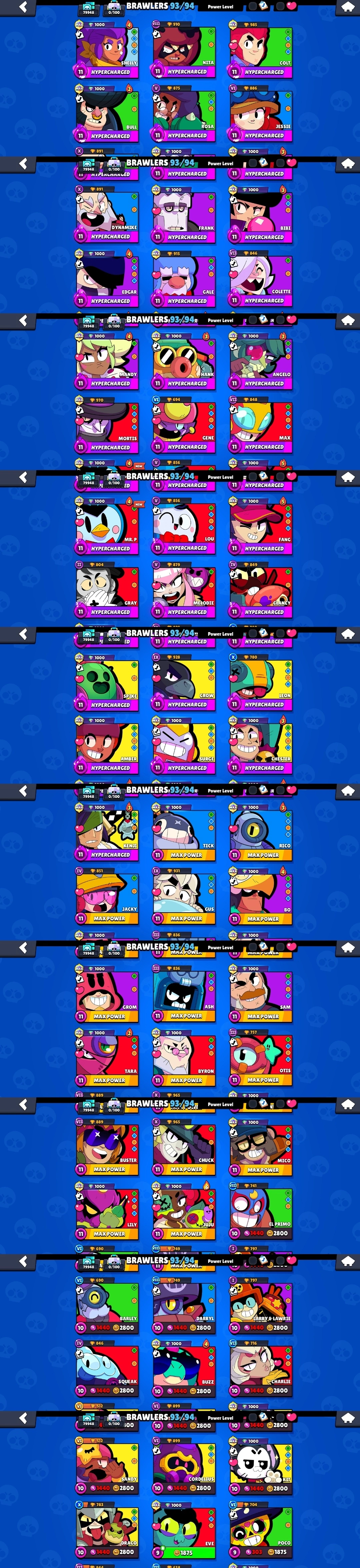 80k HTrophies 🏆 93 Brawlers 🤖 34 Max Rank 💪 [47 Max Power 💪 and 31 Hypers ⚡] 82 Rare 🟩 75 Super Rare 🟦 58 Epic 🟪 5 Mythic 🟥 8 Legendary 🟨 and 4 Hypers ⚡ CH300