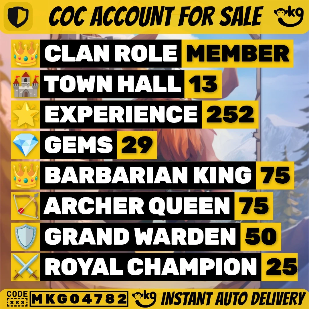 🏰 Clash of Clans ⚔️ TH13 100% MAX ✨ Level 252 ✨ BK75 AQ75 MP41 GW50 RC25 ✨ 29 Gems 🔰 Complete Access 🏰 Instant Delivery !MKG04782