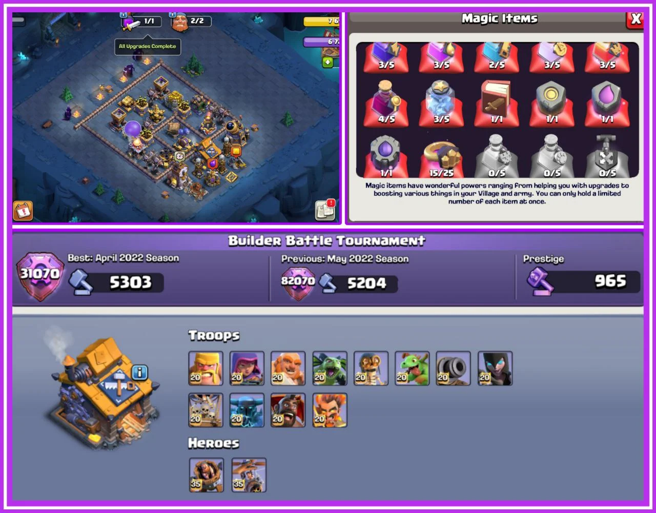 ✨️ COMPLETE CWL SET 💎 EVERY EQUIPMENT MAXED 🔥 FULLY MAXED TH 17 👑 ALL DEFENCES SUPERCHARGED 🐉 2x LEGENDARY SETS ☄️ GLOBAL RANK 1937 🎯 2.3K CWL MEDALS 🏅 OBSTACLES STACKED 🎄 5 SCENERIES & 25 HERO SKINS ❄️ 4.7K WAR STARS 🌟 100% MAX BUILDER BASE ✅️