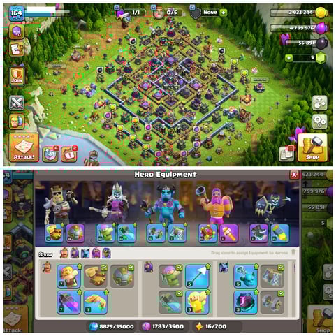 ๐ PREMIUM MAX TH17 ๐ XP 284 โ๏ธ 11 EPIC EQUIPMENTS [4 MAX] ๐ 3 SCENERYS ๐ช MAX PROFILE & BASE ๐ก๏ธ 55 HEROES SKINS ๐ NAME CHANGABLE ๐