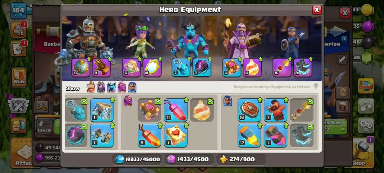 Sale🔥TH 15 almost max🔥high heroes level 80/85/57/56/37☠️7 epic equipment✅cn on✅8 heroes skin