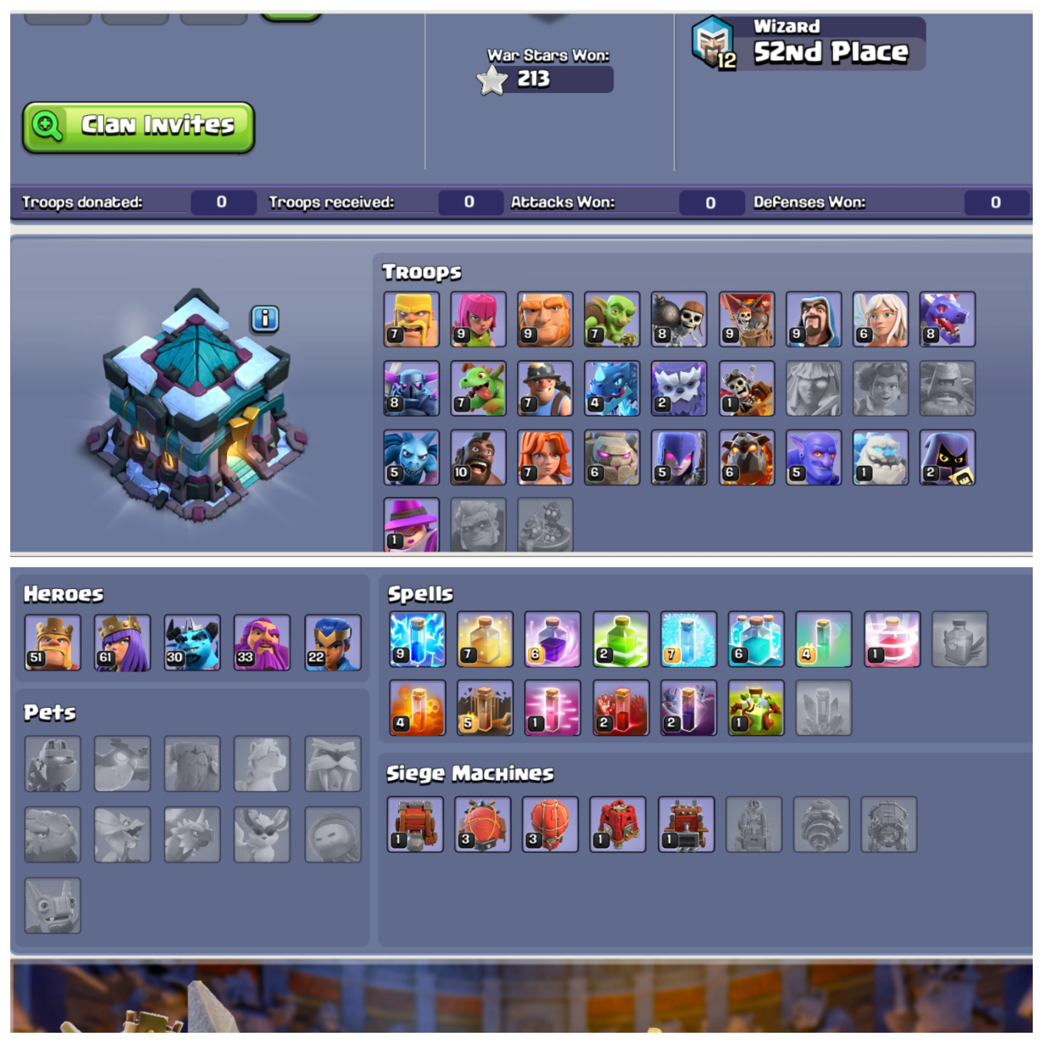 ⚡ TH 13 Near Max 🧩 6 Epic Equipments ⚒️ Heroes: BK51 AQ61 MP30 GW33 RC22 🎁 Free Name Change 💫 Fully Stacked Magic Items ⚡ Instant Delivery