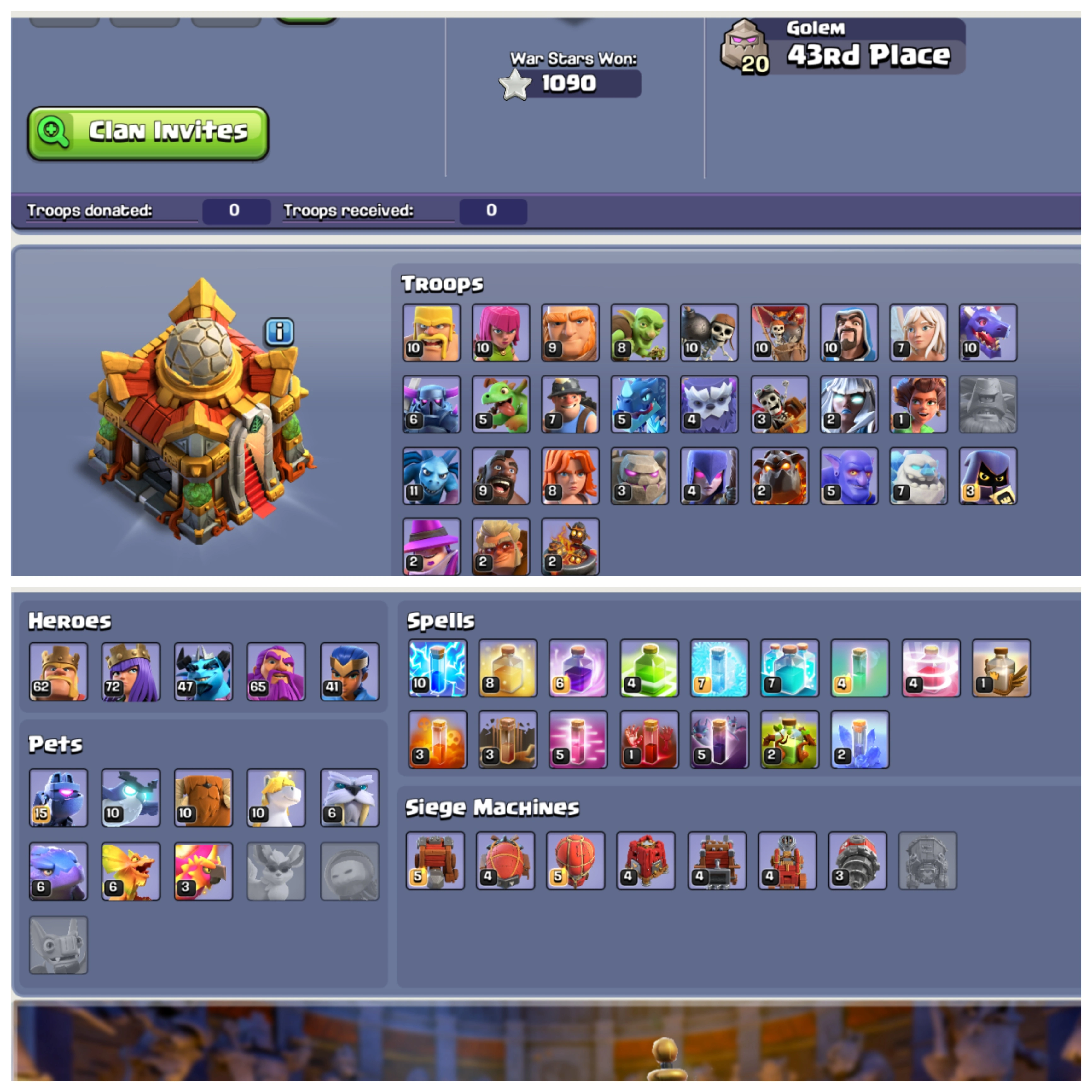 🚀 TH 16 Solid Shooter 💰 6600+ Gems 🧬 8 Epic Equipments 👑 Full Max Warden ✨ Name Changeable 🎭 6 Heroes Skins 🌟 High Value Profile ⚡ Instant Delivery