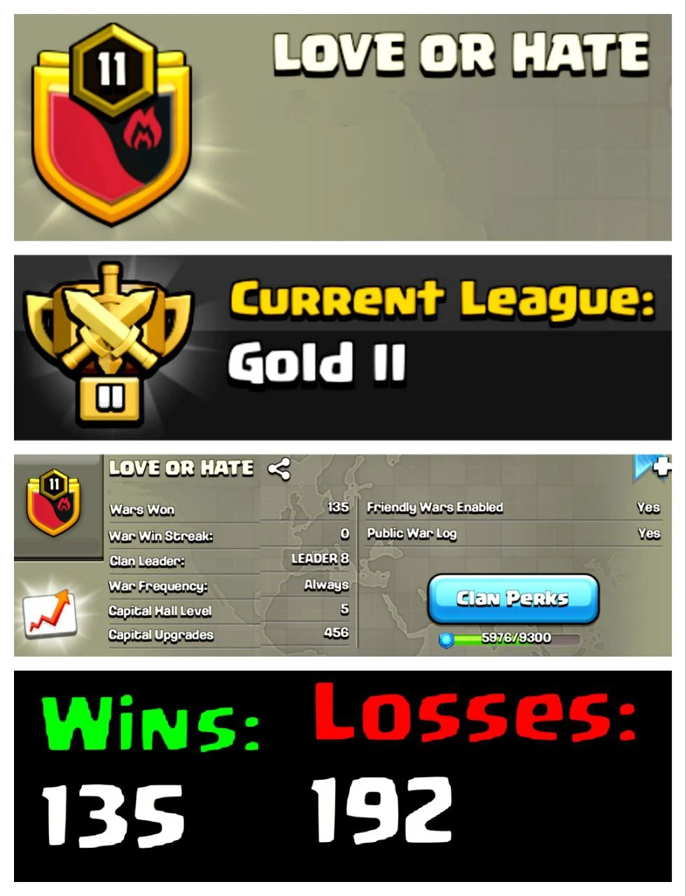 ❤🔥OP LEVEL 11 ENGLISH CLAN 💥 OP NAME : LOVE OR HATE⚡LEAGUE : GOLD 2☄ CLAN CAPITAL : 5 💥 WINS : 135 | LOSS : 192💫 BEST CLAN BUY NOW 🔥 FAST DELIVERY🚚