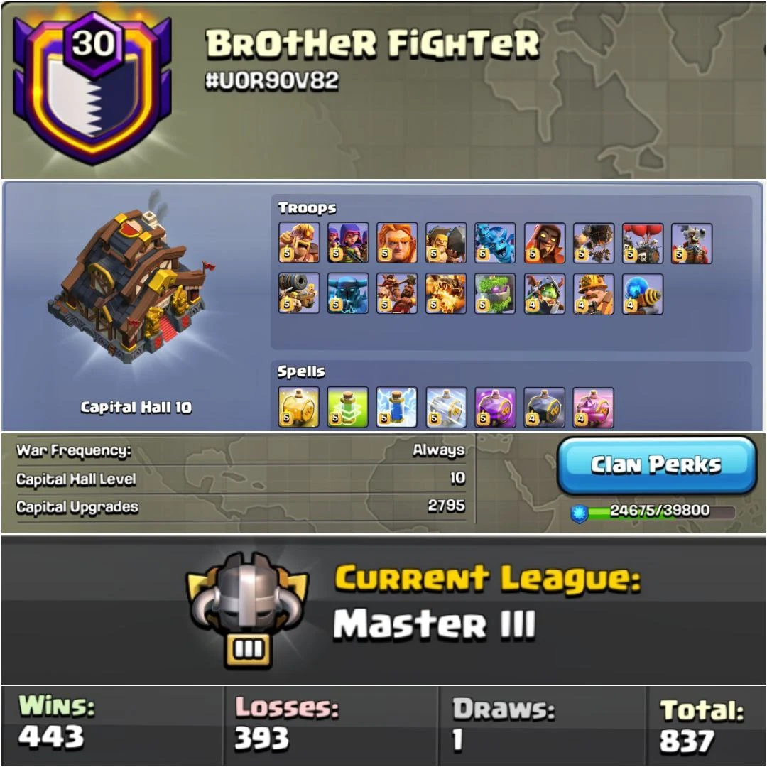 Level - 30 | Name - Brother Fighter | Clan Capital - 10 | Master League | Awesome War log | Fast delivery