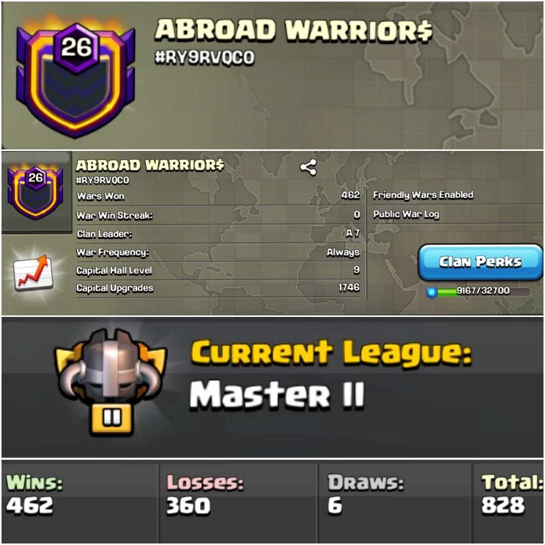 Level 26 | Name - ABROAD WARRIOR$ | Clan Capital - 9 | Master League | Awesome Warlog | Fast Delivery