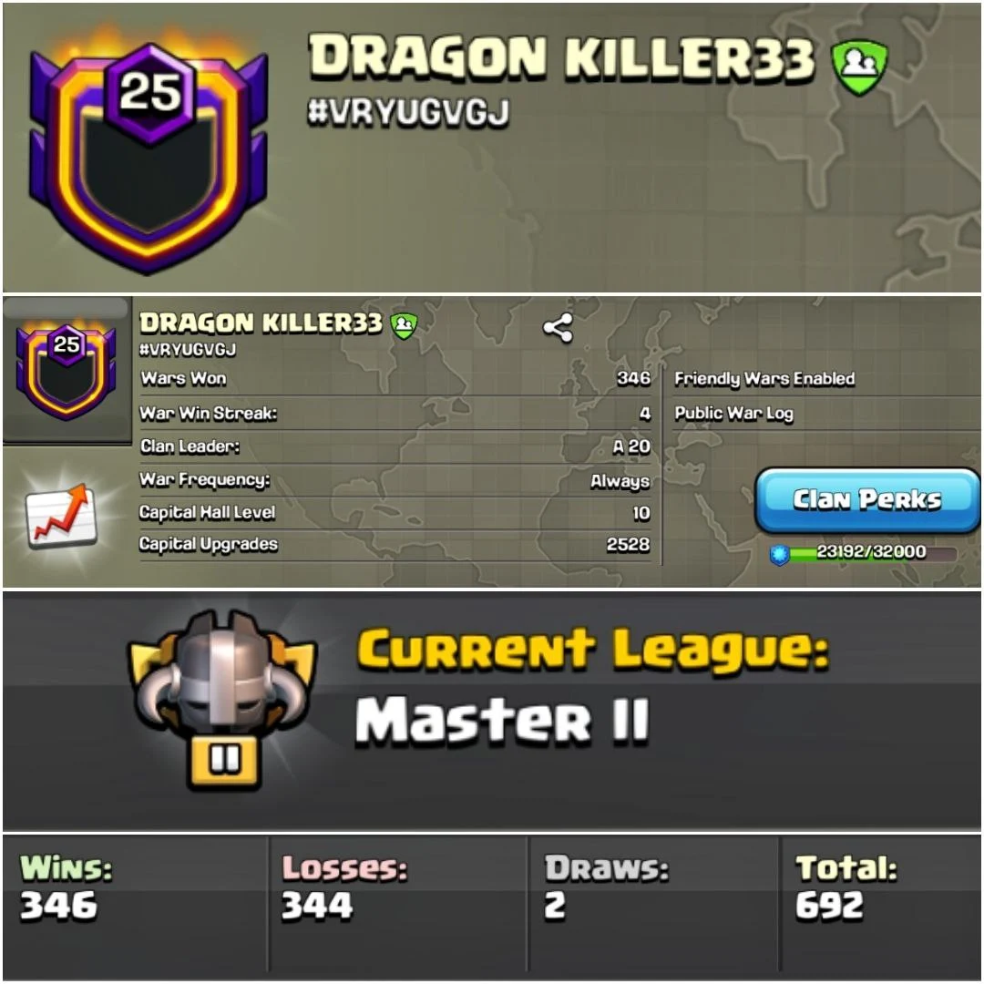 Level 25 | Name - DRAGON KILLER33 | Clan Capital - 10 | Master League | Good Warlog | Fast Delivery