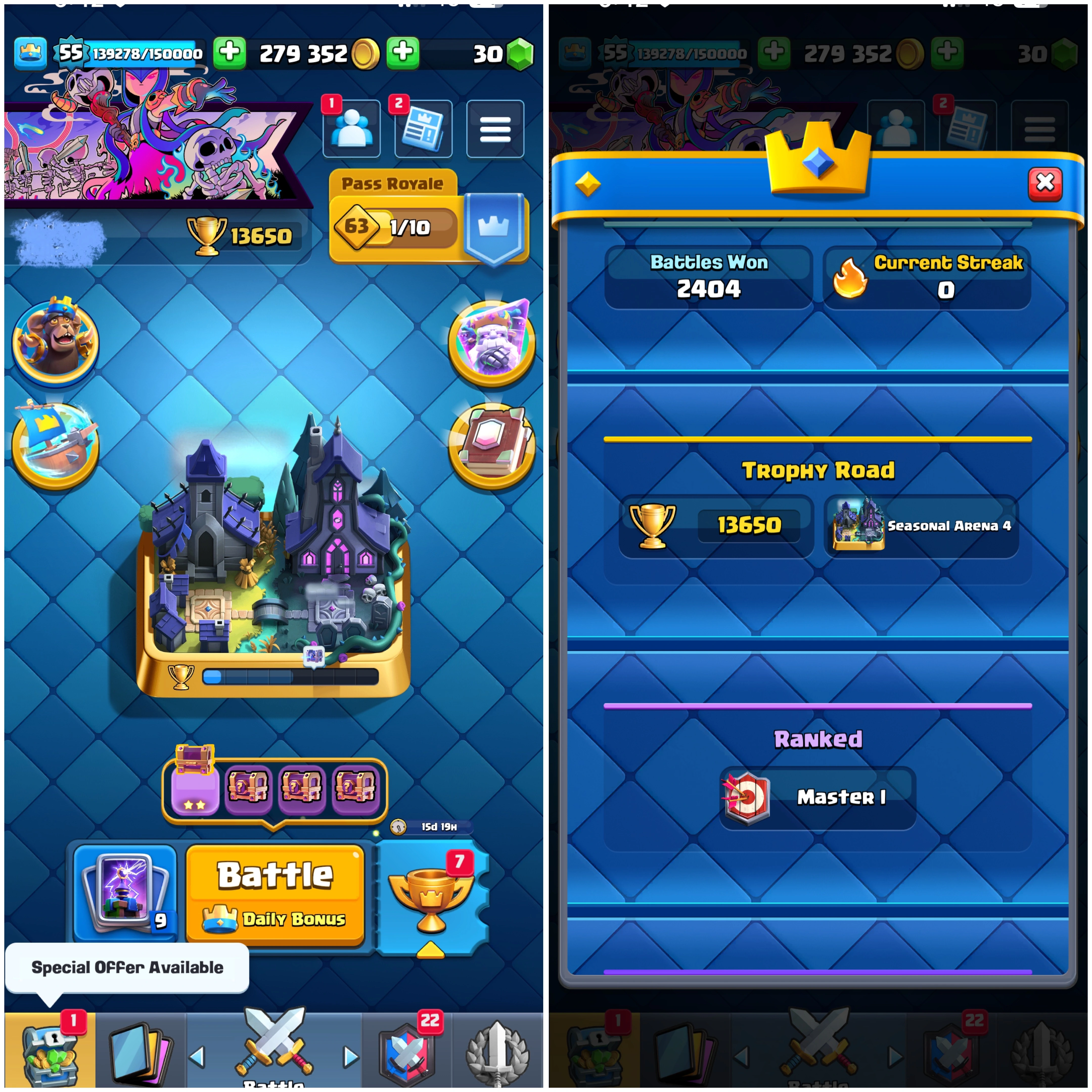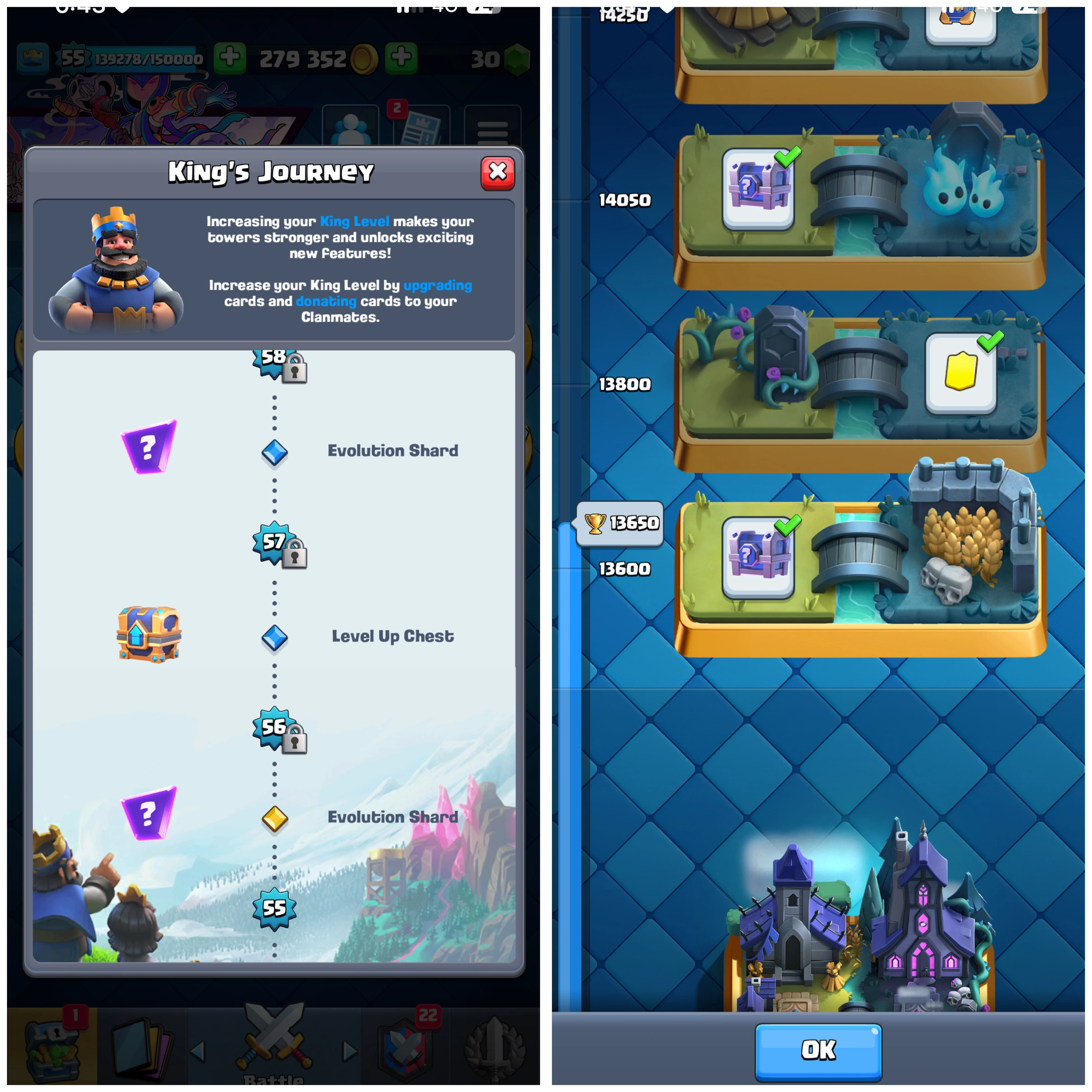 โก๏ธ 13K+ Trophies | Maxed | Instant Delivery ๐ ๐ 13650 Trophies ๐| Level 55 ๐ฅ | King Tower 15 ๐ | Arena 24 โ๏ธ | Emote 74 ๐ Cards 121 โ