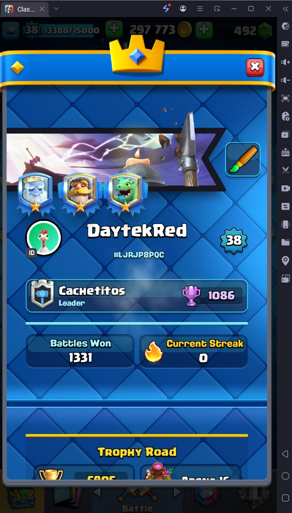 5905 TROPHY 🏆 38 LVL 💯 KT 13 👑 113 CARDS ♦️ 0 MAX CARDS 👑 0 ELITE CARDS 🔮 1 EVO 💯 EMOTE 17 🎭 #LJRJP8PQC ⸱ TAG ACCOUNT ♥️