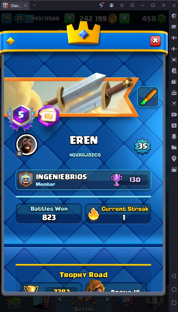 7283 TROPHY 🏆 35 LVL 💯 KT 12 👑 114 CARDS ♦️ 0 MAX CARDS 👑 0 ELITE CARDS 🔮 2 EVO 💯 EMOTE 22 🎭 #QVRGJ82CQ ⸱ TAG ACCOUNT ♥️