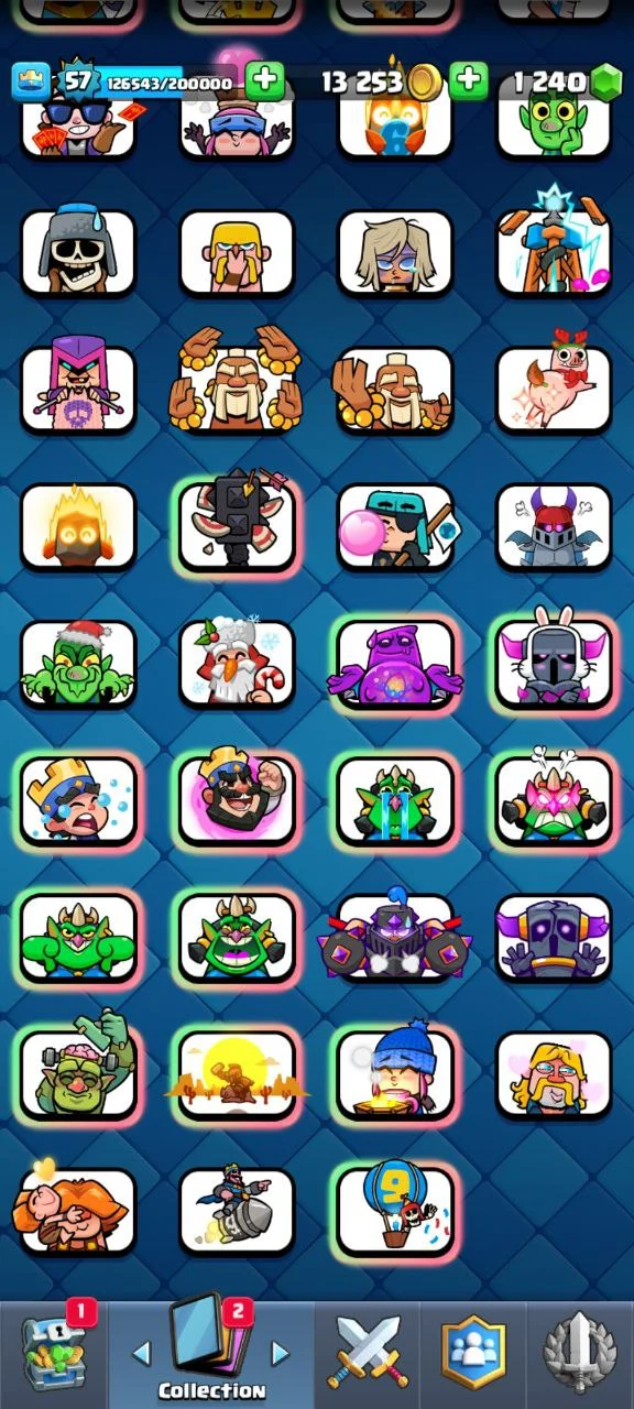 ✨️ CHEAPEST 💎 68 MAXED CARDS 👑 11 EVOLVED 😈 57 XP 🤯 9 TOWER SKINS 🌟 GOBLIN KISSING TROPHY 🏅 9 YEAR OLD BADGE 💰CANDLE HAT MINER 👑 GOBLIN EMOTES✨️9017 TROPHIES ✅